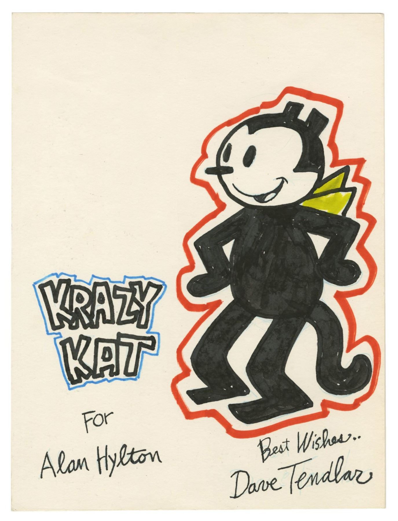 (c.1980) An original drawing of "Krazy Kat" by artist Dave Tendlar, who animated the character in the once-lost 1927 silent short film "The Stork Exchange". Accomplished in ink and marker on cardstock, the drawing measures 6.5"x4" on 9.25"x7" paper. The condition is good with a vertical crease in the paper from when it was originally mailed. The artwork is personalized "For Alan Hylton" and is signed "Best Wishes... Dave Tendlar".