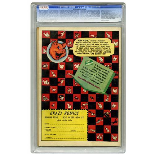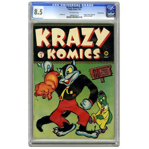 <B>Krazy Komics #1 Crowley Copy pedigree (Timely, 1942) CGC VF+ 8.5 Off-white pages.</B></I> This was Timely's first funny animal comic, and you may be surprised to know that Timely was just the second publisher to try a funny animal book (Dell being the first!). Future <B>Mad</B></I> artists Al Jaffee and Dave Berg are among the issue's contributors, and oddly enough, so is Chad Grothkopf, who drew the Sandman for DC! By the way, according to some, the first appearances of Ziggy Pig and Silly Seal here mark the first comic book funny animals who weren't adapted from other media. Overstreet 2006 VF 8.0 value = $381; VF/NM 9.0 value = $603. CGC census 4/06: 1 in 8.5, none higher.