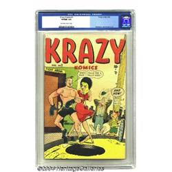 Krazy Komics (2nd series) #1 (Timely, 1948) CGC VF/NM 9.0 Off-white to white pages. One of the most interesting creators of comics has to be Basil Wolverton, whose unique art style was nicknamed the "spaghetti and meatball school of design", especially after his winning entry in the famous "Lena the Hyena" contest run by Al Capp. Wolverton was fond of throwing puns and crazy "eyeball kicks" into every panel of his humor work (he was equally adept at science fiction, too), and he remained a big influence on Harvey Kurtzman's Mad. Here's a great Golden Age comic with a whopping ten pages of Wolverton wildness, along with eight more pages from Kurtzman. It's a funnybook that really is funny, and a tight, sharp copy to boot. There are currently only two copies of this book certified by CGC; this is the better of the two by far. Overstreet 2003 VF/NM 9.0 value = $348; NM 9.4 value = $450. Important notice: Heritage usually auctions material at the rate of 200-250 lots per hour. On some occasions eBay Live bid software or the Internet may not be able to keep up with the pace of the auction. We recommend placing a realistic absentee bid now as insurance to avoid disappointment. Occasionally the auctioneer may eliminate or reject an eBay Live bid, and the auctioneer may also reopen a lot after the close of the eBay live bidding (usually because we missed an audience bid), and may reject your bid even if it shows you as the winning bidder. By bidding via eBay Live, you agree that Heritage may award the lot to another bidder at its sole discretion under the circumstances described above or any other reasonable circumstances. Since eBay bids are not shown to us until we open the lot on the floor, we treat those bids just like floor bids. In most cases the floor responds before the eBay bid is presented to us, due to Internet lag time, so for consistency we have made it a policy that floor bids are always considered first over tie eBay live bids. Also please note that all Heritage lots purchased through eBay Live carry a 20% Buyer's Premium. Please make sure you read the Terms and Conditions before you bid.