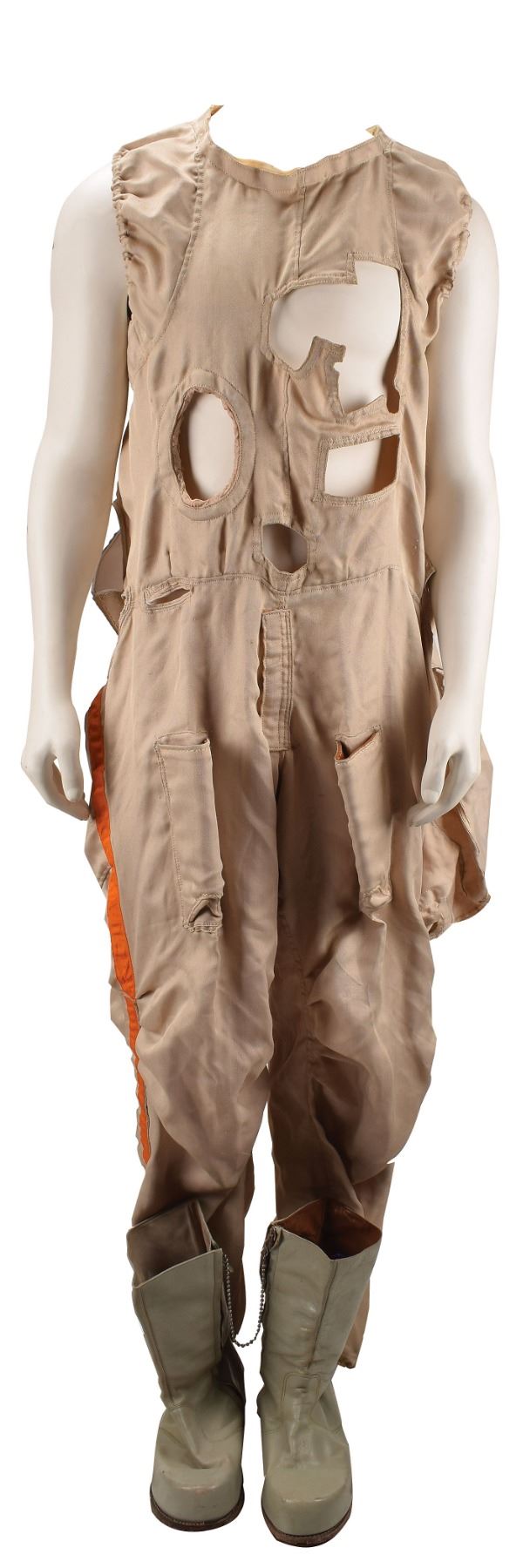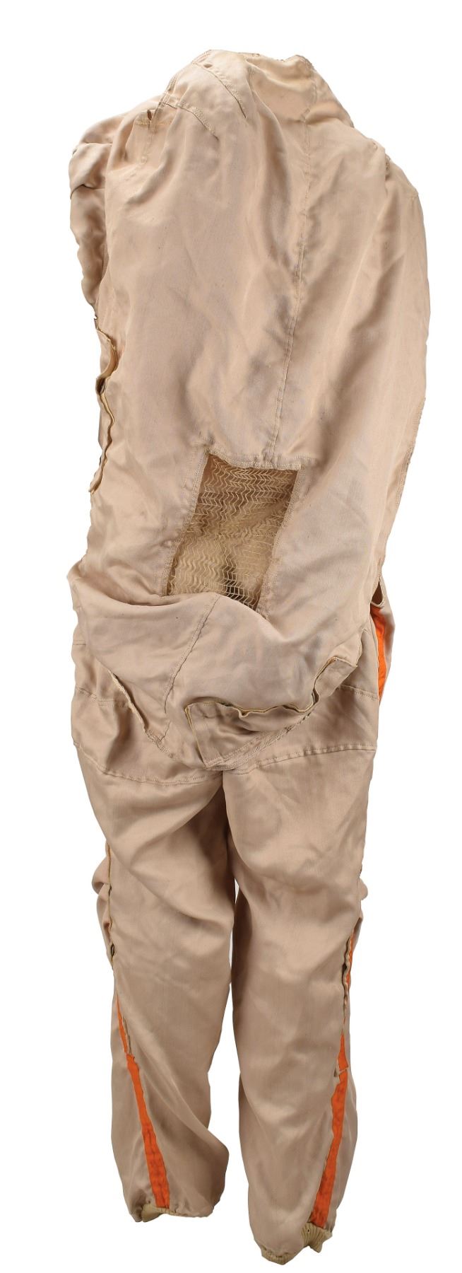 Coverall garment for the Soviet Krechet-94 lunar excursion space suit, with a Velcro-secured neck opening, elastic arm holes, and openings in the front for the suit's valves and control panel. The back has a large open flap to accommodate the suit's life support backpack, an integrated system which allowed temperature regulation, pressurization, air collection and purification, and housed the radio and electrical apparatus. The light gray nylon coverall has orange stripes down the sides, and pockets on the front of each thigh. Includes a pair of zippered leather Krechet high boots intended for a moonwalking expedition: the right boot has a light gray suede lining, and the left boot has a smooth brown lining. In overall very good condition, with some scattered soiling to the coverall and boots, and creasing to the boots' leather.