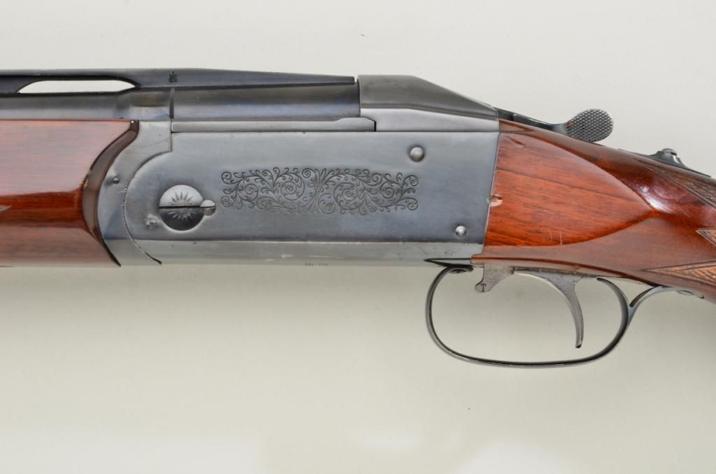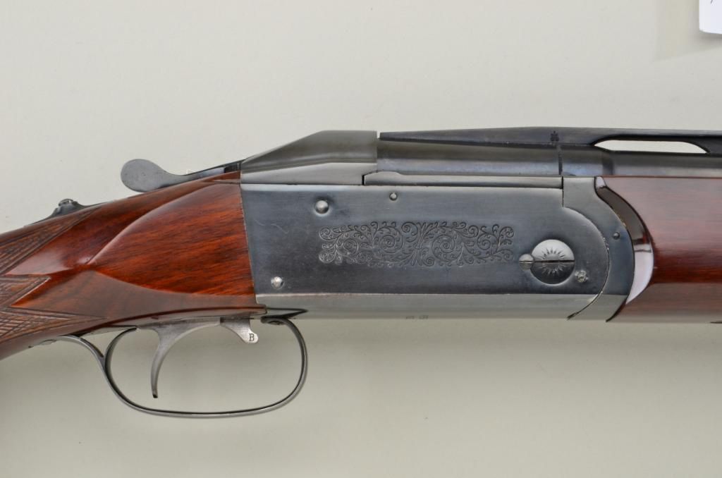 Kreighoff Model 32, 4 barrel set in 12, 20, 28 and 410 gauge with hydro coil and select burl wood stock in Gun - Ho carrying case, serial #6644. The gun shows 4 matching number Kreighoff marked barrels, all of which are 28” in length and skeet choked. The condition is very good plus to near fine, 90-95% original blue thinning on bottom of frame and edges. The stocks are also near fine with minor scratches and use. The hydro coil stock is pumped up and working properly. The case is good to very good. The stock measures 14-1/2” to the end of the thick rubber pad and is standard factory dimensions. Est.;$5,000-$10,000.