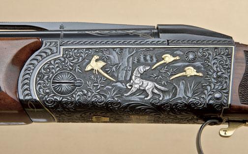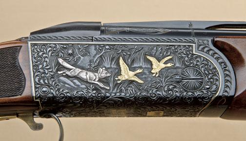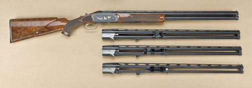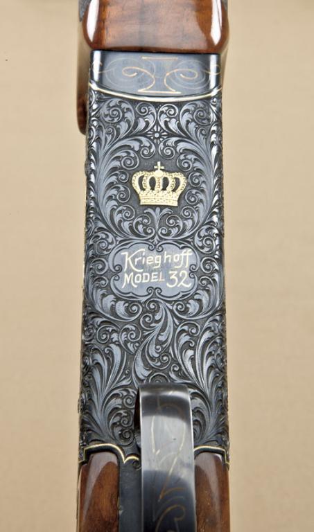 Kreighoff Model 32 gold-crown, 4-barrel skeet set, 12ga, over/under shotgun. Highly engraved, gold and silver inlaid, deluxe wood hydrocoil (air cushion) type stock. Serial #4565. The gun shows beautiful early typeKrieghoff engraved with beautiful silver scrolls, dog at center surrounded by game birds, gold line borders, gold crown at bottom of frame, Kreighoff and “Model 32” flush gold inlaid, gold crown inlay onrelease. The metal surfaces are in fine to near excellent condition showing n96-98% original blue, some evidence of minor use, the barrels are all serial numbered to match and all 28” showing raised ventilated ribsand split barrels, fit to one forend with engraving and gold and silver inlay which is matching at the breeches. The deluxe checkered stocks are in good to very good condition and would be near fine other thanthe fact that the recoil mechanism has broken in the stock and needs repair that we would estimate at under $300. From the Robert Petersen collection. Est: $7,500 - $15,000