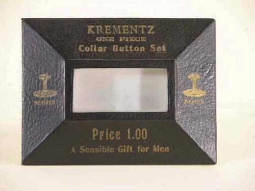 "Krementz" collar button display frame. Leather cover/wood/glass. Rare store display. 7"x5".