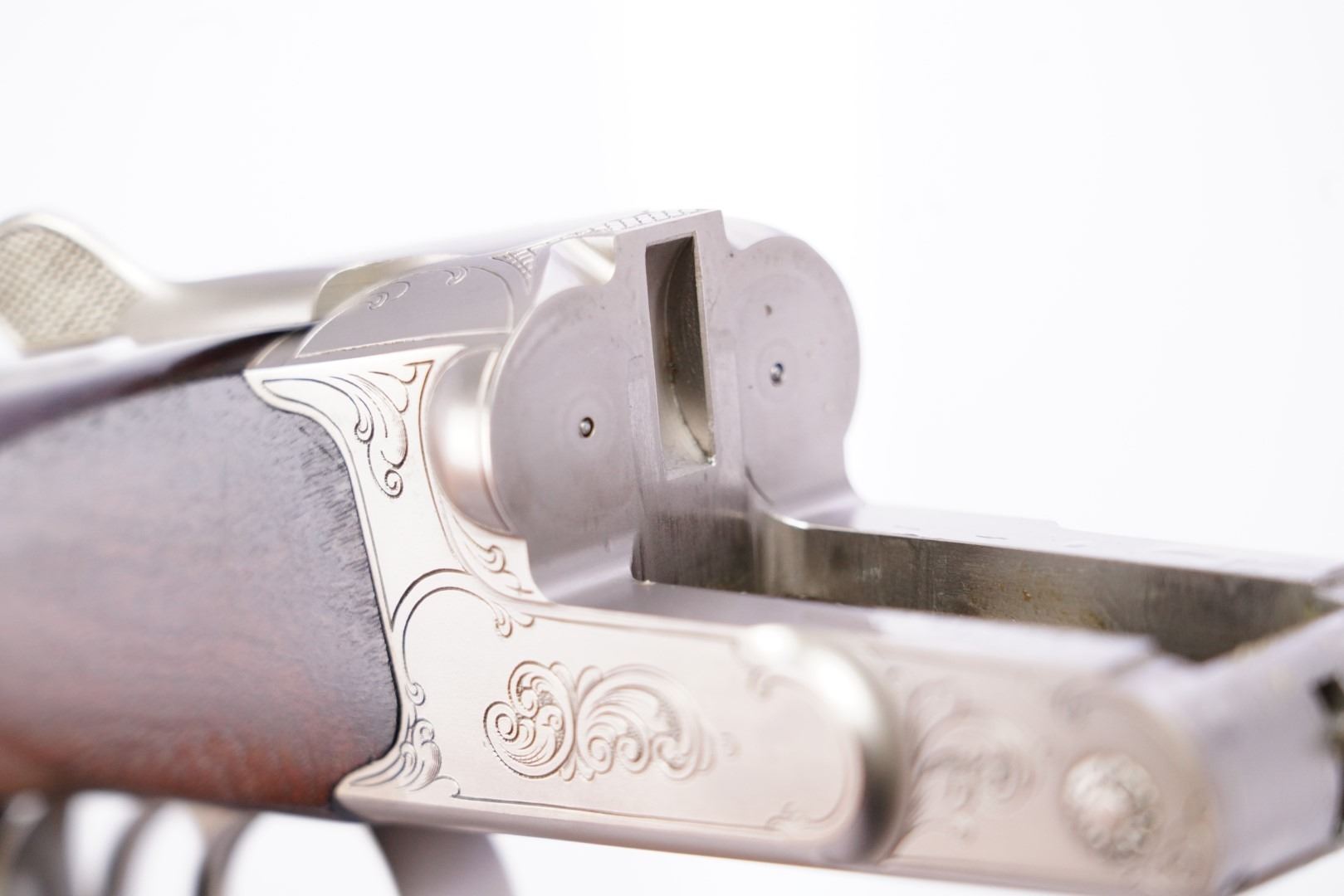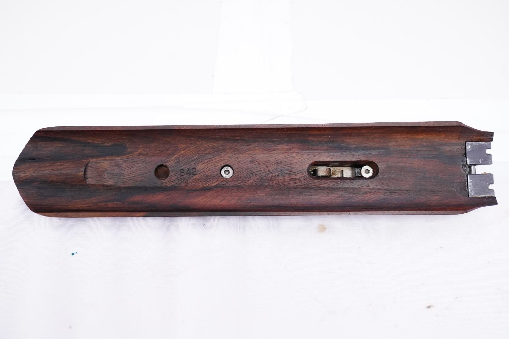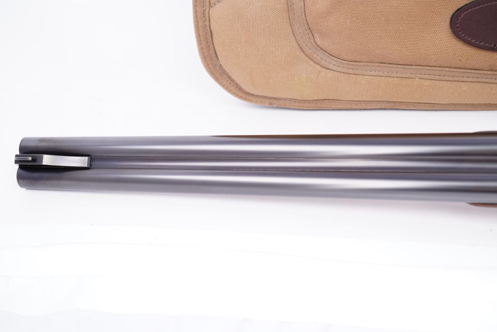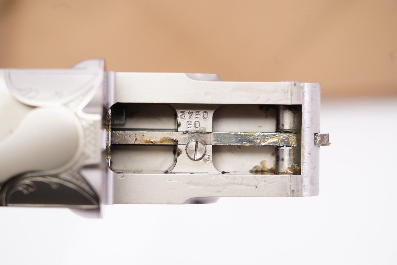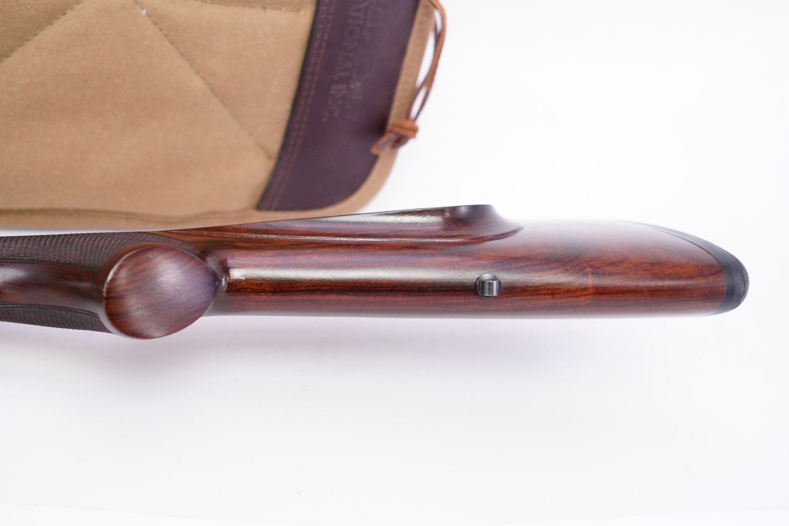 Overall Condition: This rifle retains about 97% of its metal finish. There are some scattered light handling marks. There are a few light marks on the crowns, more notable on the left bore. Some of the hard edges have faint finish wear, hardly noticeable. There are a few tiny freckles of discoloration on the "in the white" surfaces. There is operational wear. The markings are clear. Overall, this rifle rates in about Fine Plus condition.