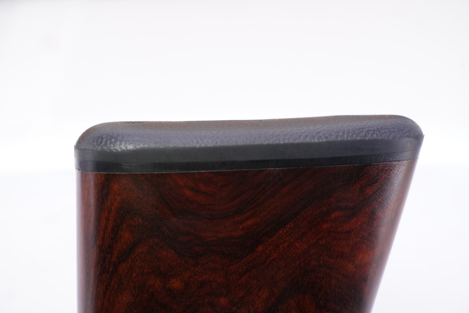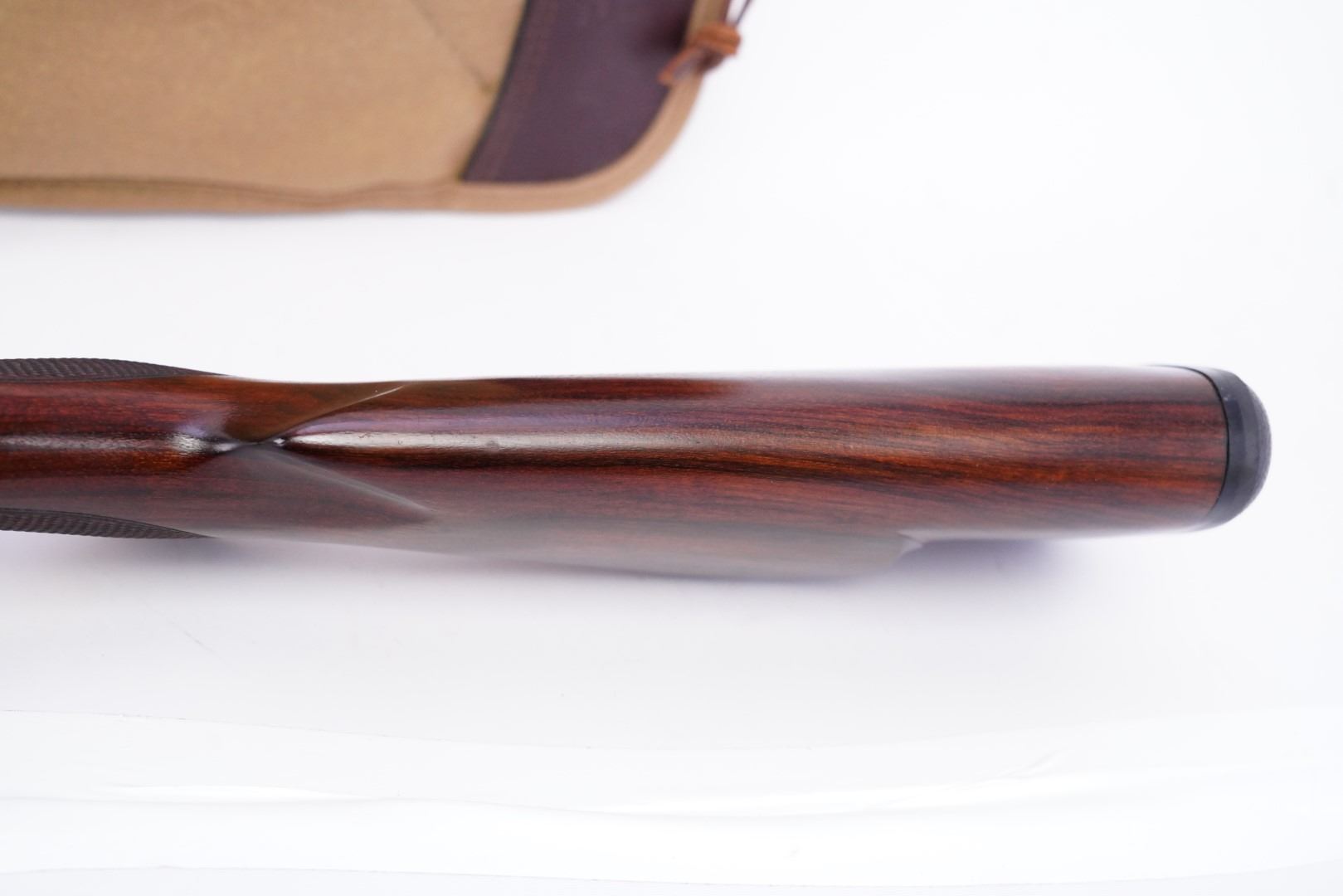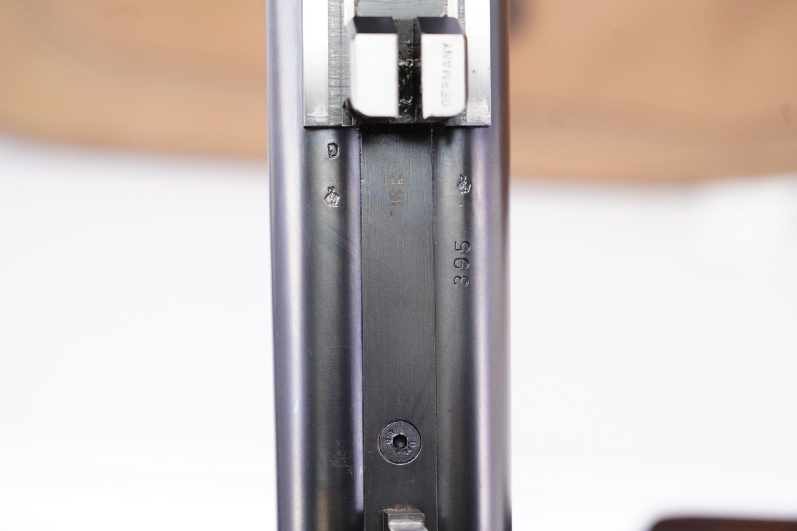 Stock Configuration & Condition: The stocks are checkered walnut with a pistol grip with a right side palm swell, cheekpiece, Schnabel tip semi-beavertail forend, and rubber buttpad. There are a few light marks from handling and storage. The checkering is strong. The LOP measures 14 1/2" and 13 5/8" from the fronts of the triggers to the back of the buttpad and 13 1/8″ and 14″ to the wood. The pad spacer is slightly proud in areas. The pad has light wear. The stocks rate in excellent overall condition.