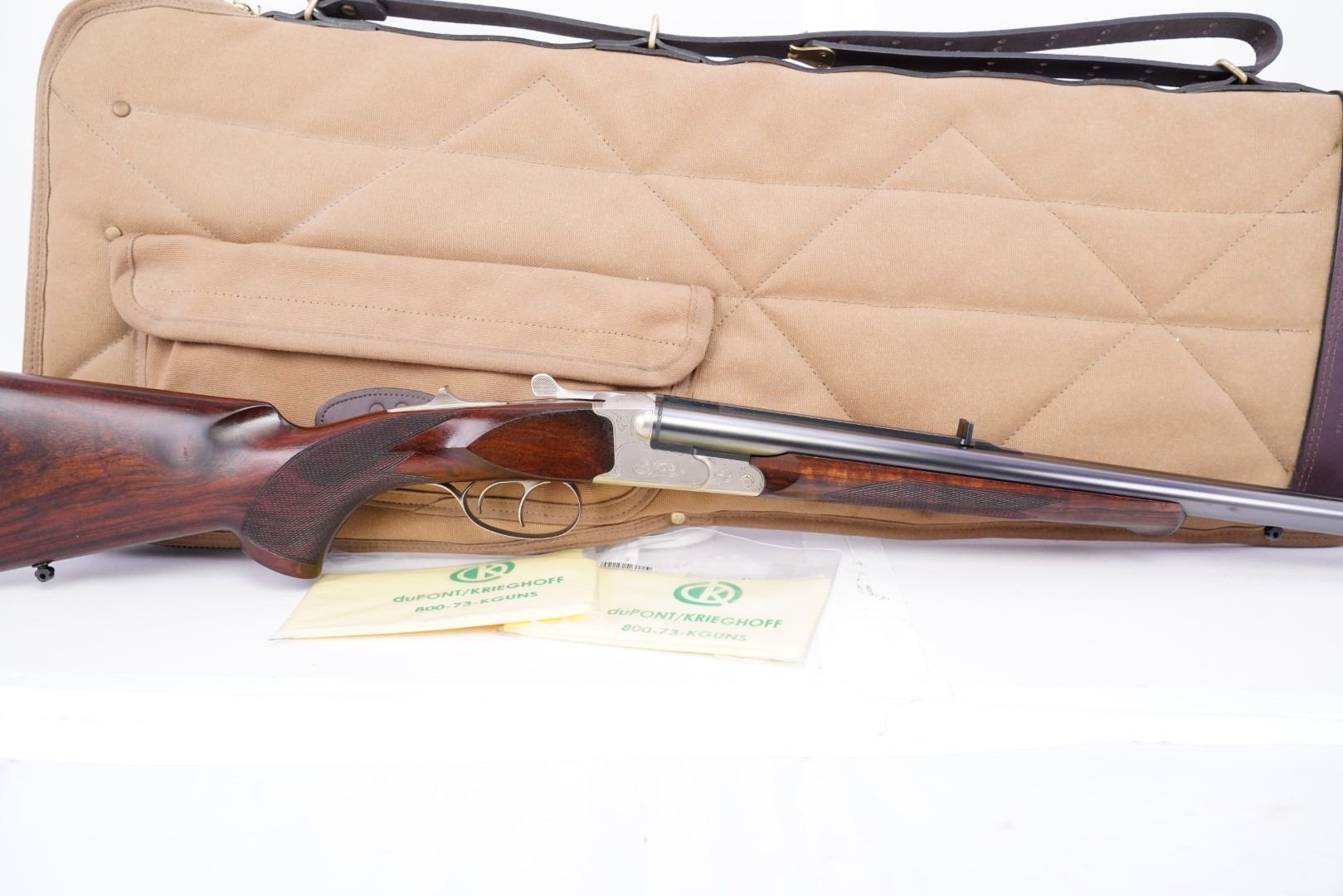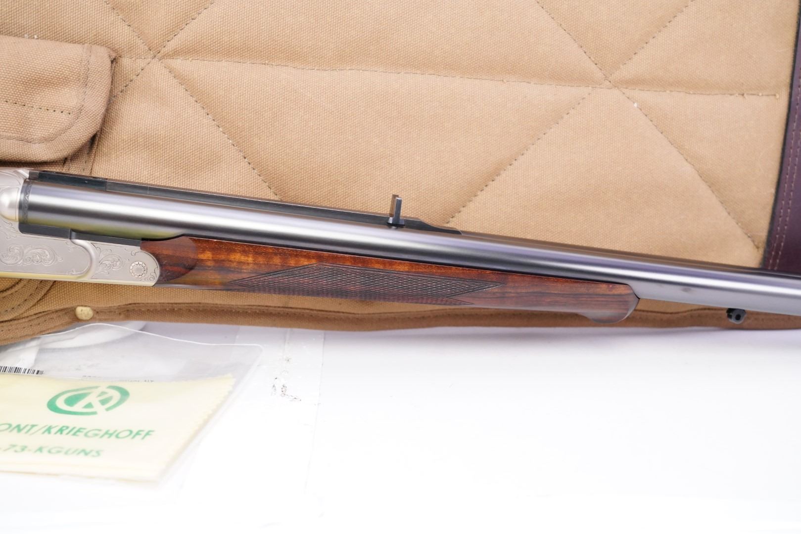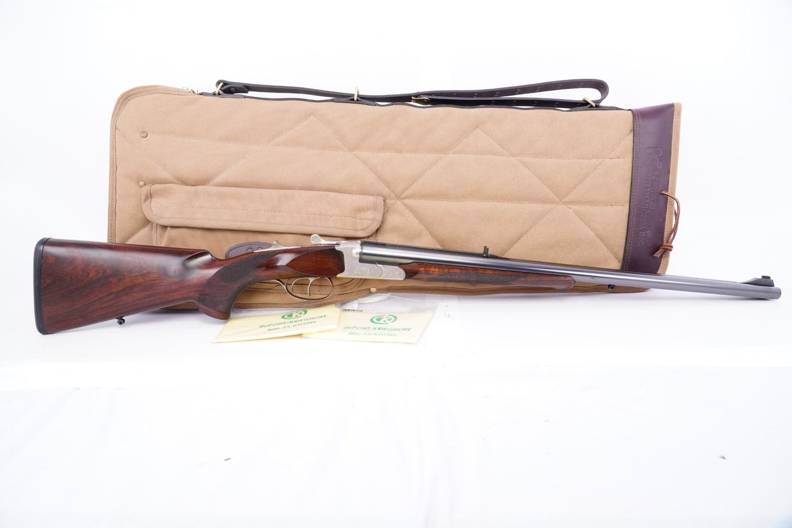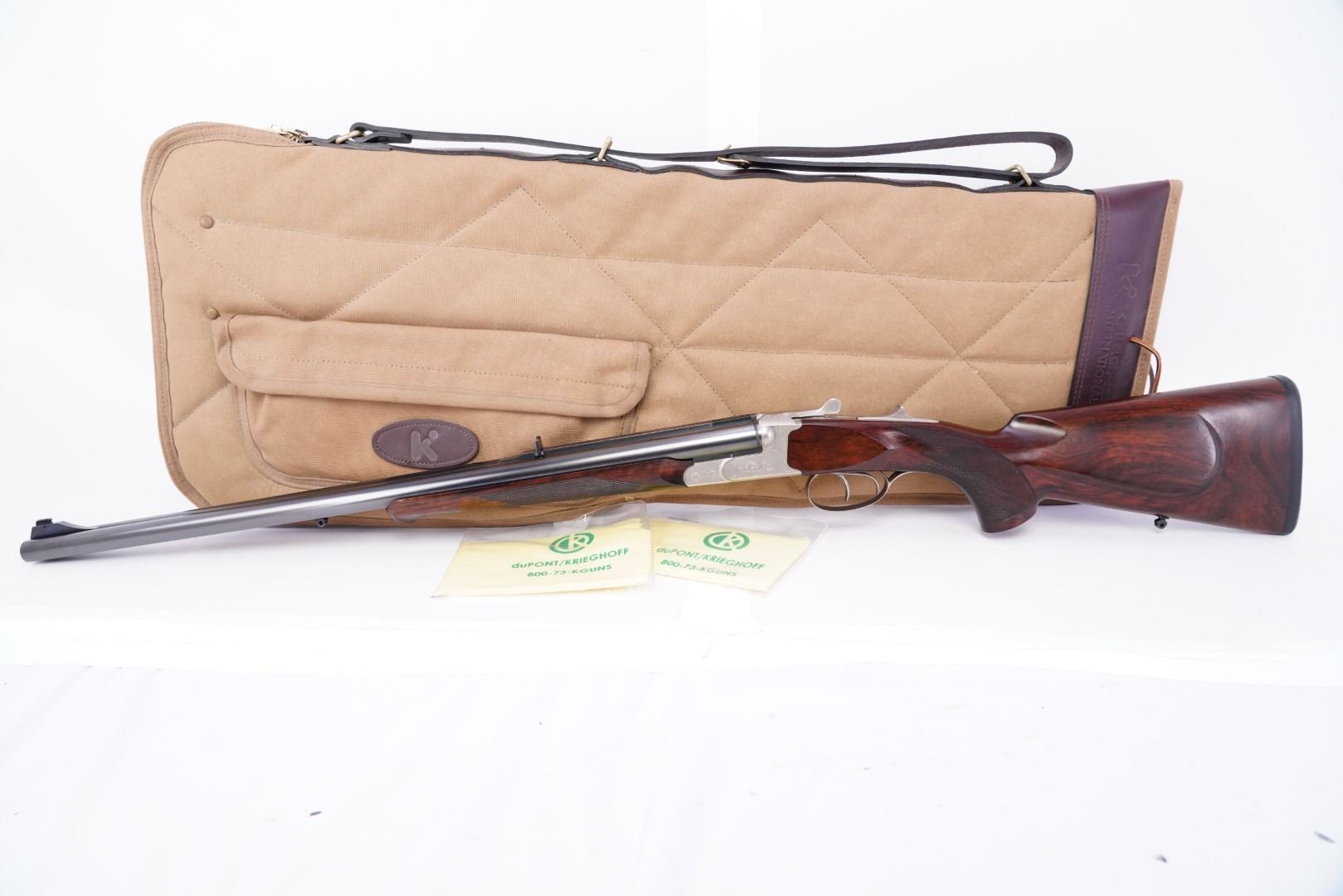 Our Assessment: H. Krieghoff GmbH – known worldwide as "Krieghoff" – began as a single vision to build the ideal hunting gun, a Drilling. Krieghoff’s evolution from its 1886 founding as Sempert and Krieghoff to one of the top manufacturers of fine hunting and sporting arms currently spans five generations, each with an innovative eye to the future. Reflecting its roots, Krieghoff continues to build and offer hunting arms, such as drillings, rifles including double rifles and shotguns including a bespoke line of true sidelock arms. With their pure elegance, first-class craftsmanship and proven technology, these masterpieces of the art of gunmaking fall into the same category as the highly coveted "best" english or Italian guns.This is one of their bespoke rifles, the Classic "Big Five" Double Rifle. Nothing epitomizes the skills and experience needed for a successful hunt like taking game with a classic double rifle. Prized by dangerous game hunters for years, the classic double rifle provides the security and reliability when each shot really counts. The Krieghoff Classic "Big Five" Double Rifle combines the heritage of the traditional side-by-side and the sophistication of the most modern design and manufacturing technology. Krieghoff’s master gunmakers combined both traditional wisdom and innovative ideas to build a rifle that provides the ultimate in safety and reliability and a wide range of features that ensure smooth, quick, and accurate shooting. In addition to the superb handling of the rifle, a most important feature is the manual cocking device, which is located on the top tang, in the position usually occupied by a conventional safety. It allows carrying the rifle fully loaded with the hammers uncocked – the safest position since there is no chance of an accidental discharge. Craig Boddington, an accomplished hunter and knowledgeable writer remarks: "After using it in the field, I am increasingly impressed with your cocking device versus a traditional safety. Great rifle, and of course it performed wonderfully."This one has seen little use and looks absolutely beautiful. The bores in its nominal 24" barrel set are nice and the mechanics are Safari ready. If you have the stones to chase the African "Big Five" (lion, leopard, rhino, elephant and African buffalo) then you are certainly ballsy enough to drop a bid! Please see our photos and good luck!