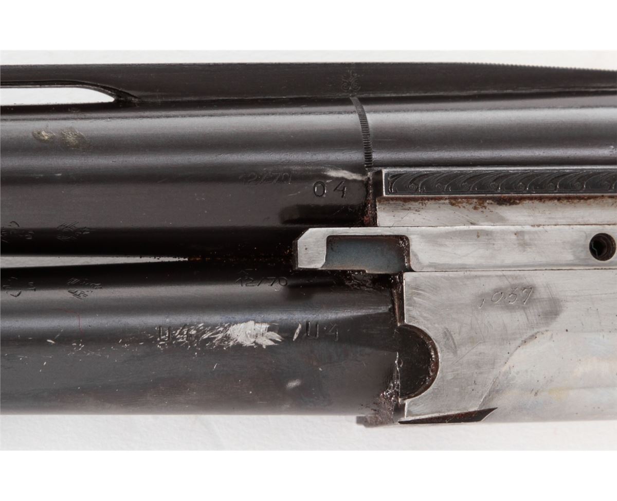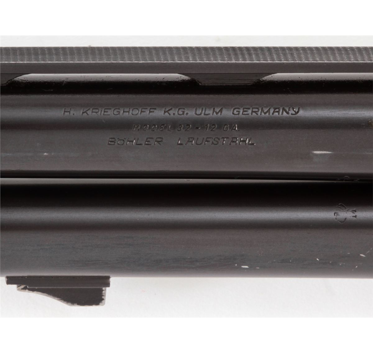 Krieghoff Model 32 Top Single Trap Shotgun Barrel, #1055, 12 ga., 2-3/4'', 30'' blue with .732'' bore and extra full .058'' constriction, 8mm tapered ventilated rib with white front and silver middle beads, Ulm Proof date 3/62. Condition is excellent with 98% blue and bright bore, includes snap cap weight; missing both ejector screws. Est.: $500-$800.