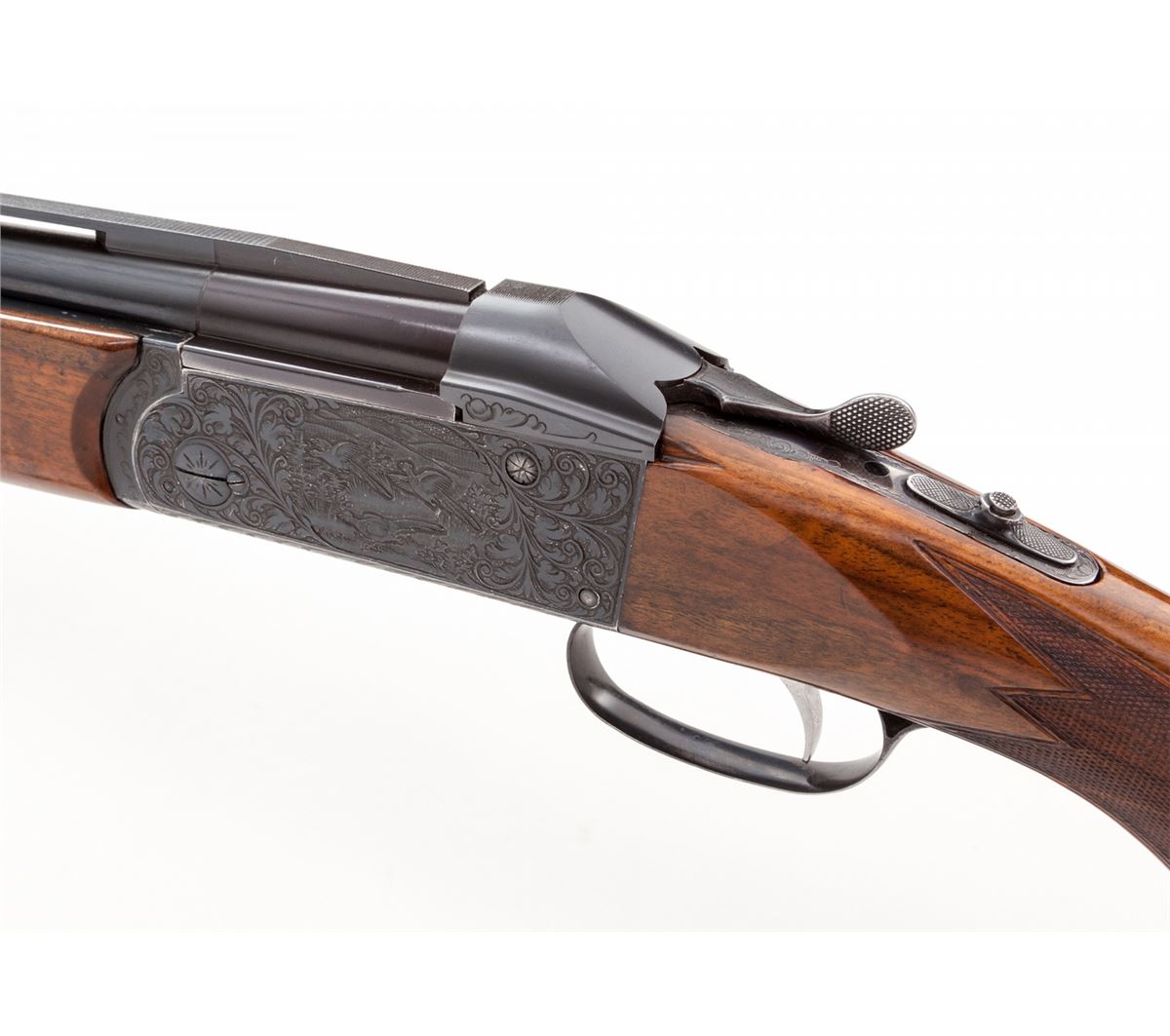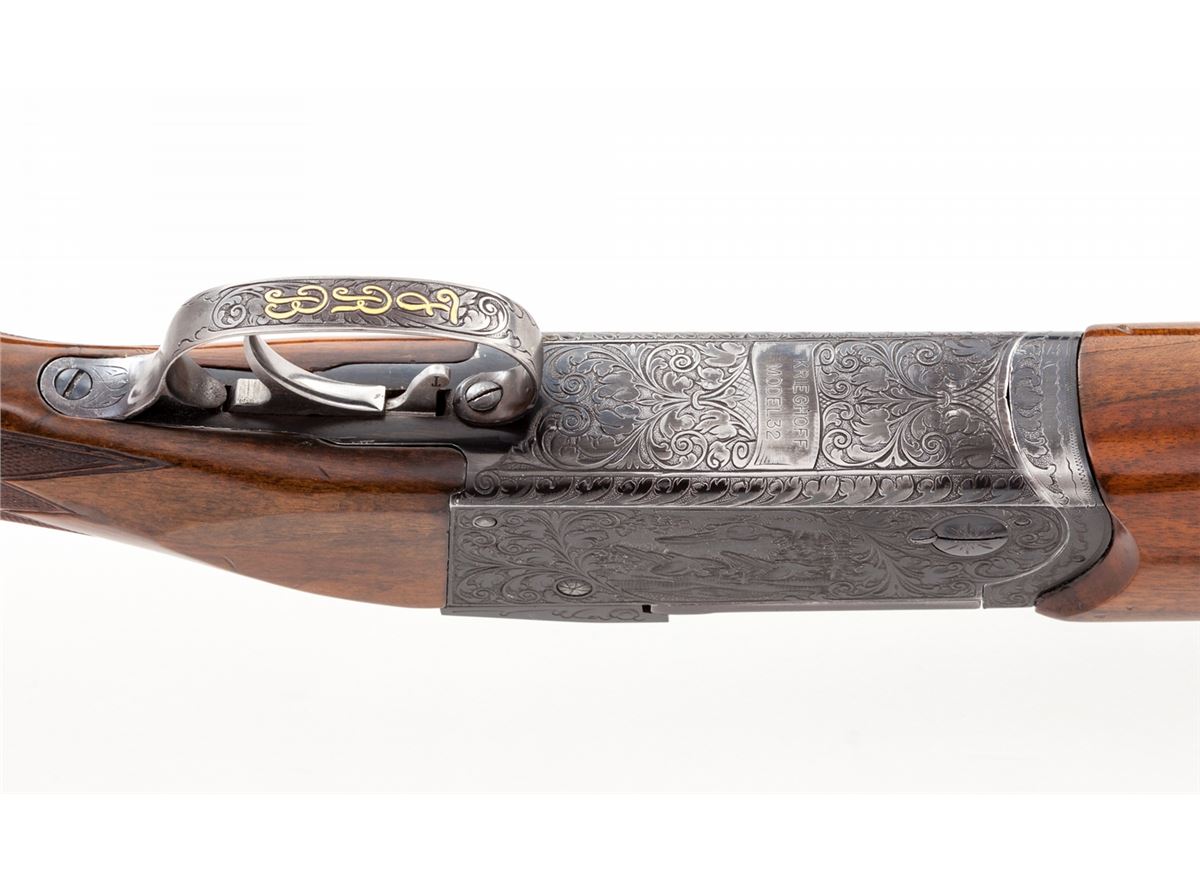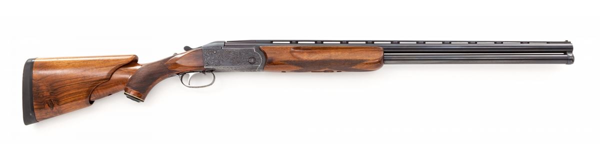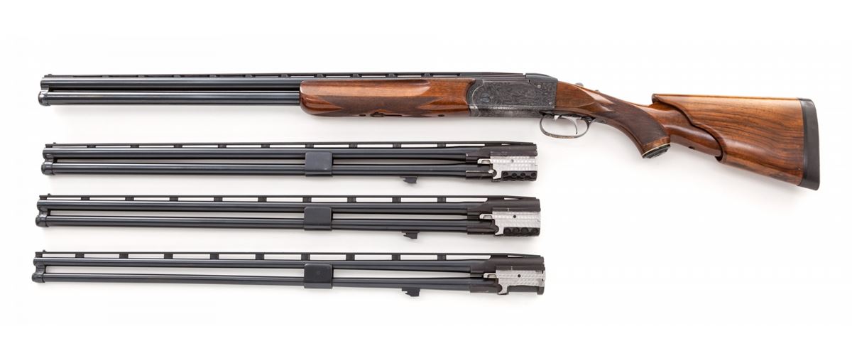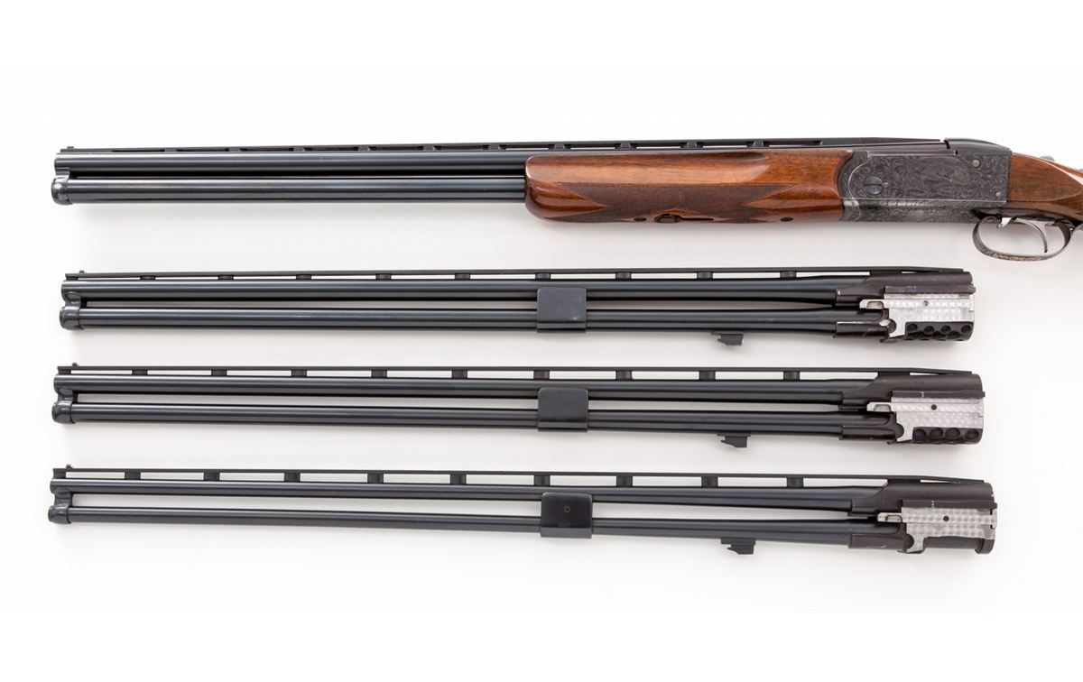 Early Krieghoff San Remo Model 32 Over/Under Shotgun With Four Fitted Barrel Sets and Five Sub-Gauge Insert Sets, #577, blue finish, single selective mechanical trigger with barrel selector toggle in the trigger guard and manual top tang safety, all barrels 28'' with 8mm ventilated ribs, white front and silver middle beads, no import marks. Bbl. 1) #577, 12 ga., 2-3/4'', Ulm Proof date 9/59, bores measure .740'' and .736'', originally marked ''TRAP''. The top barrel choke is opened to .006'' and the bottom barrel is threaded for removable choke tubes with a 010'' tube installed. Bbl. 2) #577, 20 ga., 2-3/4'', Simmons Kansas City address on rib, bores measure .615'' and .614'', no choke constriction. Bbl. 3) #577, 28 ga., 2-3/4'', Simmons Kansas City address on rib, bores measure .563'' with .007'' and .005'' chokes. Bbl. 4) #577, .410'', 2-3/4'', chokes stamped Skeet/Skeet, Simmons Kansas City address on rib. Sub-gauge inserts by Briley are 20 ga., 28 ga., and .410'', all with removable skeet chokes installed; sub-gauge inserts by Purbaugh are 28 ga. and .410'' both with skeet chokes and matching ejectors. The San Remo Model frame is fully engraved in the Germanic style with broad leaf-scroll patterns and punch-dot backgrounds which border game scene panels having three pheasant in woodlands on the left side and three ducks in a reeded pond on the right side, the engraved triggerguard bow is gold inlaid with script initials ''F-R-B''. The stock and forearm set are custom Hydro-Coil replacements with 28 LPI checkering and a black 7/8'' soft rubber recoil pad. Length of pull compressed is 13-1/4'', extended is 14-5/8'', drop at comb is 1-1/4'', drop at heel is 1-1/2'', assembled weight with bbl. 1 is 8-1/2 lbs. Frame and bbl. 1 are contained in a tan leatherette and wood key lock trunk case, no keys present; the small bore barrels are in an early Browning small bore Hartmann fitted luggage case with barrel tools, accessories and spare parts, no keys. Overall condition is very good with 95% blue on the frame and barrels along with scattered scuffs and fine scratches on the barrel ribs; barrel and insert bores are bright, the trigger and barrel selector are slightly loose in the action, the sliding safety is deactivated and locked in the ''FIRE'' position, the Hydro-Coil cylinders are inactive, barrel lock-up is firm but should be inspected along with internal action components. Stock wood has moderate use and handling marks, more noticeably on the forend. Est.: $4,000-$6,000. (C&R)
