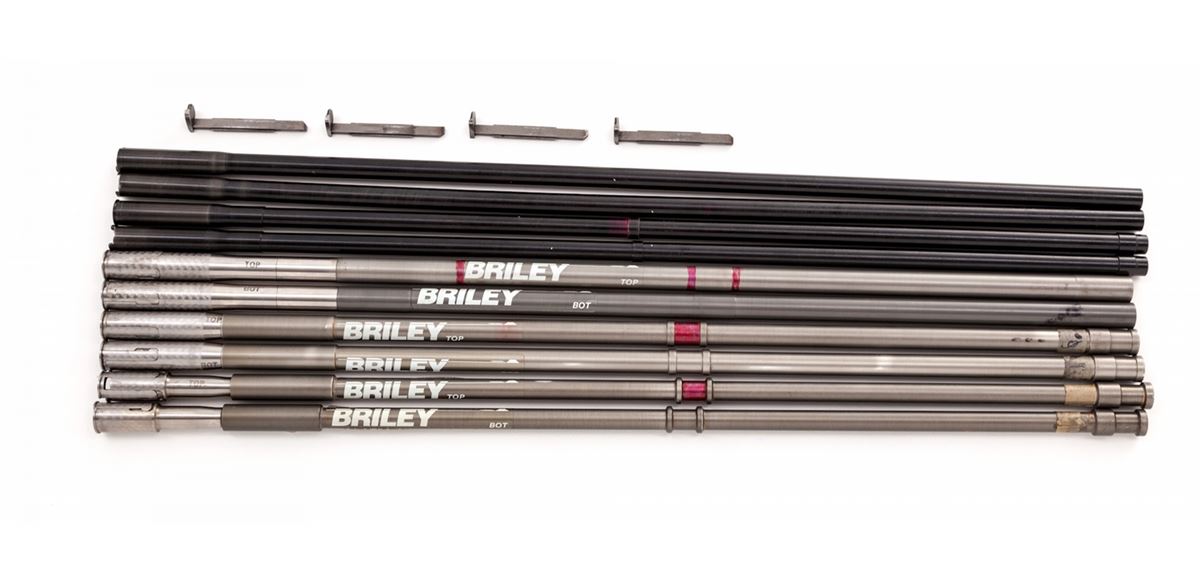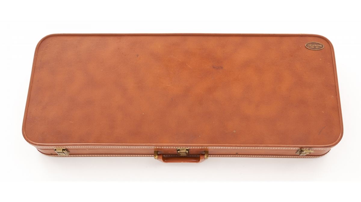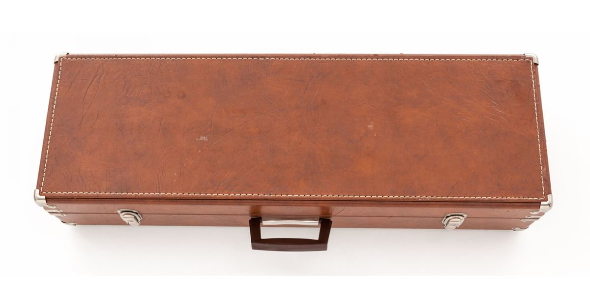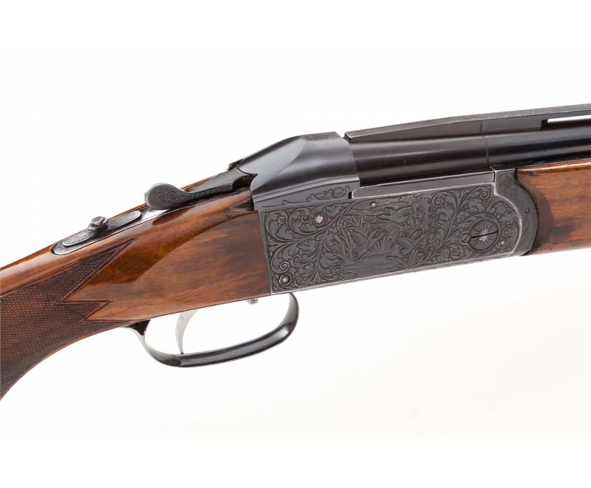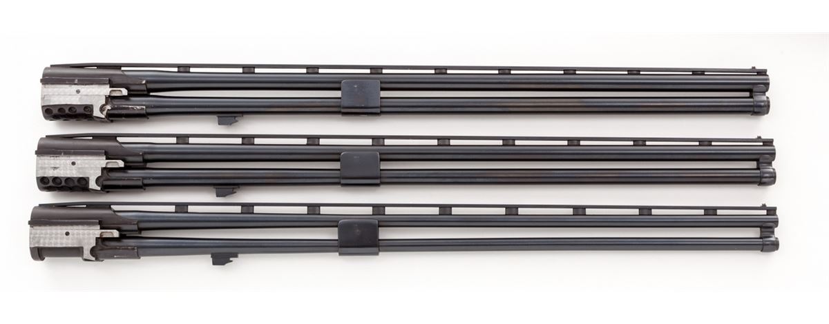 Early Krieghoff San Remo Model 32 Over/Under Shotgun With Four Fitted Barrel Sets and Five Sub-Gauge Insert Sets, #577, blue finish, single selective mechanical trigger with barrel selector toggle in the trigger guard and manual top tang safety, all barrels 28'' with 8mm ventilated ribs, white front and silver middle beads, no import marks. Bbl. 1) #577, 12 ga., 2-3/4'', Ulm Proof date 9/59, bores measure .740'' and .736'', originally marked ''TRAP''. The top barrel choke is opened to .006'' and the bottom barrel is threaded for removable choke tubes with a 010'' tube installed. Bbl. 2) #577, 20 ga., 2-3/4'', Simmons Kansas City address on rib, bores measure .615'' and .614'', no choke constriction. Bbl. 3) #577, 28 ga., 2-3/4'', Simmons Kansas City address on rib, bores measure .563'' with .007'' and .005'' chokes. Bbl. 4) #577, .410'', 2-3/4'', chokes stamped Skeet/Skeet, Simmons Kansas City address on rib. Sub-gauge inserts by Briley are 20 ga., 28 ga., and .410'', all with removable skeet chokes installed; sub-gauge inserts by Purbaugh are 28 ga. and .410'' both with skeet chokes and matching ejectors. The San Remo Model frame is fully engraved in the Germanic style with broad leaf-scroll patterns and punch-dot backgrounds which border game scene panels having three pheasant in woodlands on the left side and three ducks in a reeded pond on the right side, the engraved triggerguard bow is gold inlaid with script initials ''F-R-B''. The stock and forearm set are custom Hydro-Coil replacements with 28 LPI checkering and a black 7/8'' soft rubber recoil pad. Length of pull compressed is 13-1/4'', extended is 14-5/8'', drop at comb is 1-1/4'', drop at heel is 1-1/2'', assembled weight with bbl. 1 is 8-1/2 lbs. Frame and bbl. 1 are contained in a tan leatherette and wood key lock trunk case, no keys present; the small bore barrels are in an early Browning small bore Hartmann fitted luggage case with barrel tools, accessories and spare parts, no keys. Overall condition is very good with 95% blue on the frame and barrels along with scattered scuffs and fine scratches on the barrel ribs; barrel and insert bores are bright, the trigger and barrel selector are slightly loose in the action, the sliding safety is deactivated and locked in the ''FIRE'' position, the Hydro-Coil cylinders are inactive, barrel lock-up is firm but should be inspected along with internal action components. Stock wood has moderate use and handling marks, more noticeably on the forend. Est.: $4,000-$6,000. (C&R)