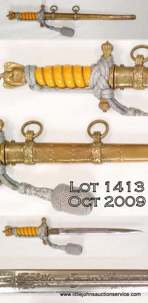 Kriegsmarine Officer's Dagger By W.K.C.. The blade is approx. 9 7/8" long, and is a nickel/silver plated, drop forged steel construction, stiletto style blade with dual, narrow, central fullers to each side. Both sides of the blade feature an aci etched design with fouled anchors, a trident, serpents and an ornate foliage pattern. The blade shows light wear, and retains a mirror bright factory finish, and is in overall excellent condition. The reverse ricasso features thedie-stamped W.K.C. maker's mark. The standard brown leather blade washer is intact. The dagger has a nicely detailed, fire gilted, brass construction crossguard and pommel which are both intact and show minor age tarnish. The crossguardfeatures an embossed fouled anchor to both the obverse and reverse centerpieces and an ornate foliage pattern and rosette tips to the horizontal arms. The reverse centerpiece of the crossguard has an integral, spring loaded, locking buttonwhich is fully intact and still functions. The pommel is a likeness of the Wehrmacht style eagle with down-swept wings clutching a canted, wreathed swastika. The dagger has a yello celluloid grip mounted on a wooden sleeve with twisted, dual