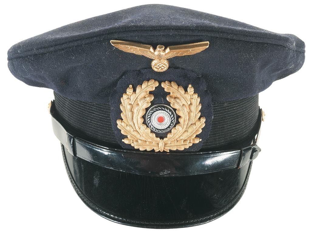 Black wool construction with ribbed band, alloy cockade, gilt eagle, wreath and buttons, black leatherette chinstrap and visor, brown sweatband and blue cloth lining with "Karl Steiner/Neu-Ulm" marked under the sweat diamond. Good overall, with some cracking of the strap, visor and band.