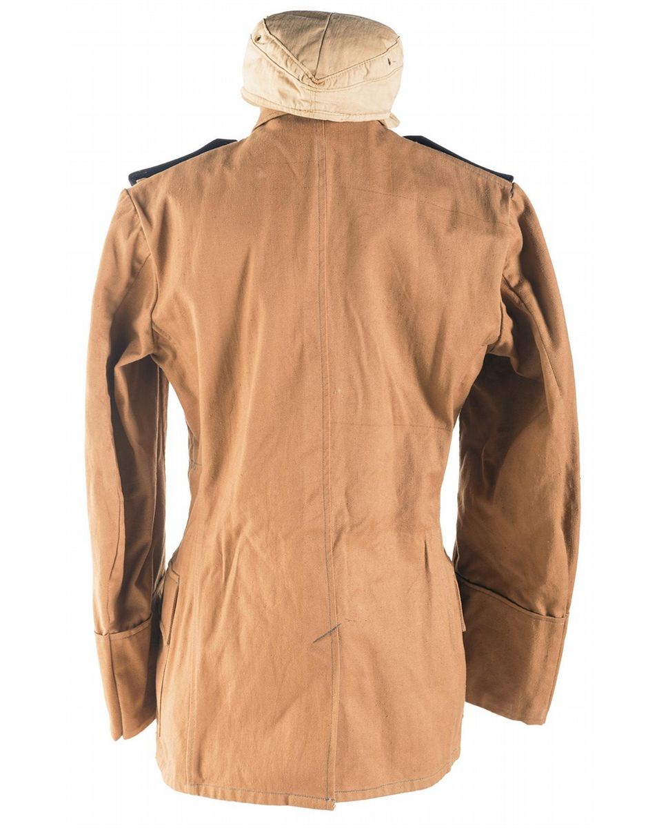 1) M41 pattern cap, tan cotton construction with 2 piece eagle and cockade patches on the front, tan rayon inner lining and ink stamps on the interior reading "Ste/CHAPELIERE/PARIESIENNE/PARIS", "54" and "72". 2) Kriegsmarine tropical tunic, brown cotton construction with a green and gold national eagle patch over the right breast pocket, with ventilation holes in the armpits and a RB number of "0/0549/0091" on the white cloth partial liner. Buttons are brass with fouled anchor designs and a pair of navy blue felt shoulder boards with gold ribbon trim.
