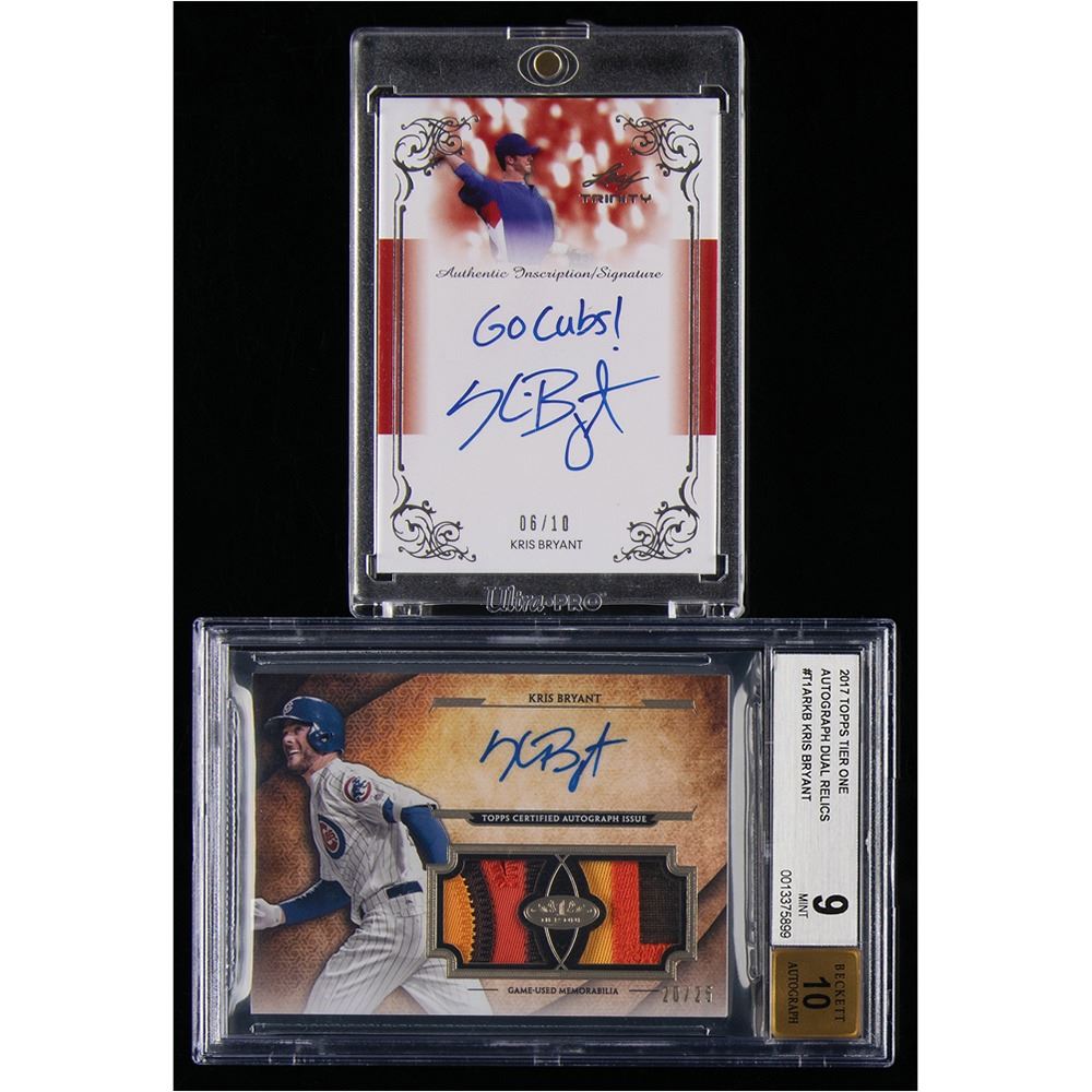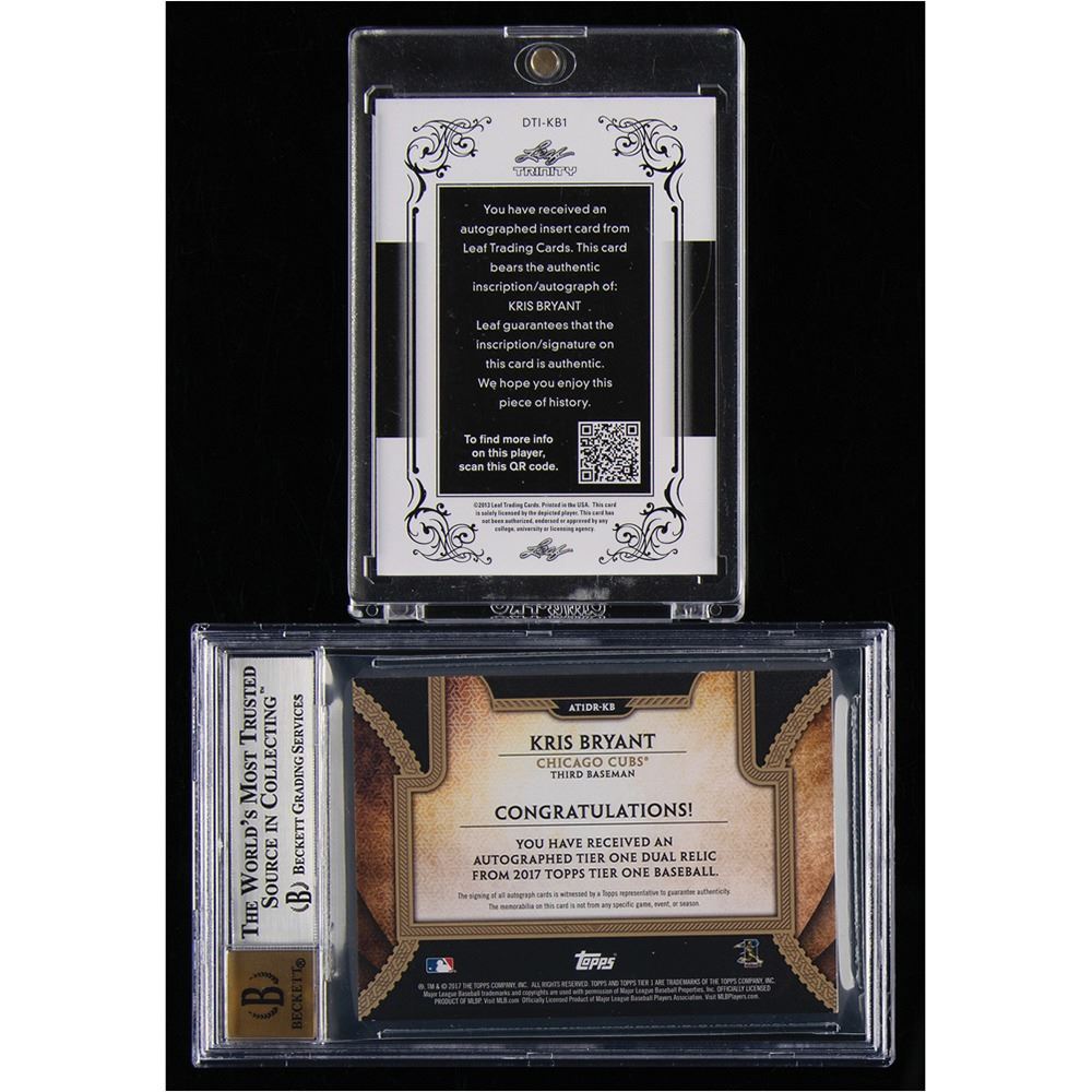 2017 Topps Tier One Kris Bryant Autograph/Patch (20/25): Graded by BGS MINT 9, with an autograph grade of 10. Nice autographed dual game-used patch card of Chicago Cubs third baseman Kris Bryant, numbered 20/25, featuring a perfect signature and two nice three-color patches.