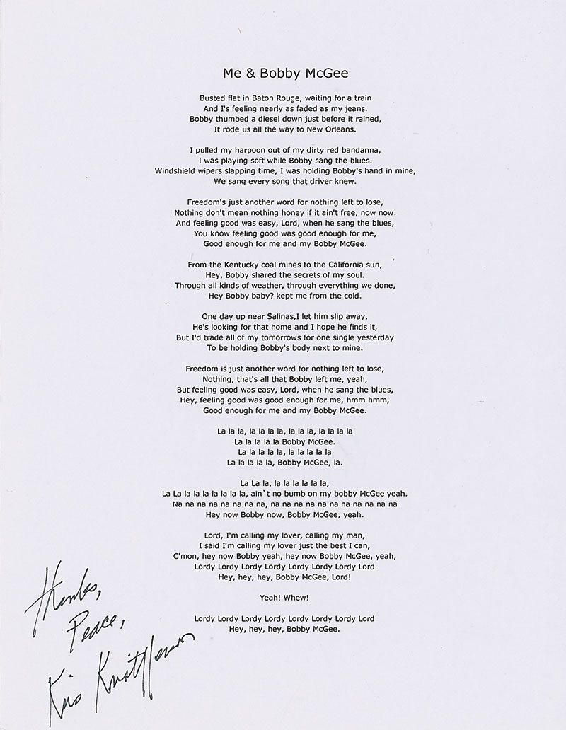 Printed souvenir lyrics to ‘Me & Bobby McGee,” one page, 8.5 x 11, signed at the bottom in black felt tip, “Thanks, Peace, Kris Kristofferson.” In fine condition.