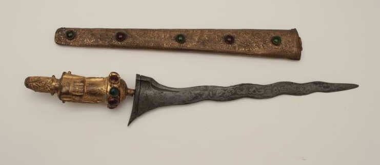 Kris dagger with sheath, approximately 22” overall with deity grip containing multi-color stones. Est.: $200-$400.