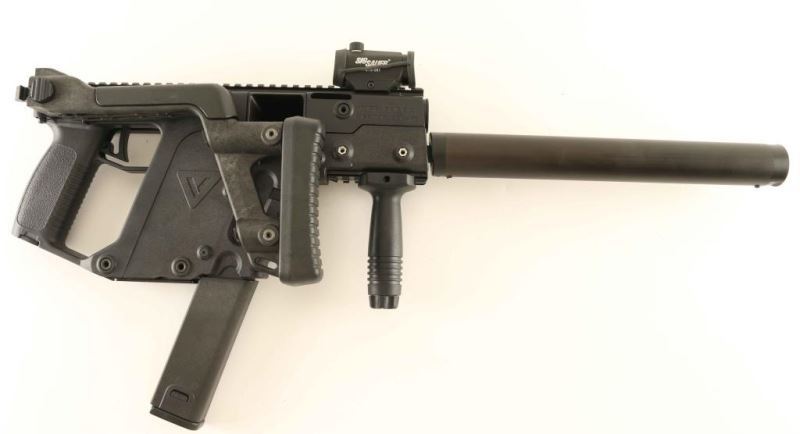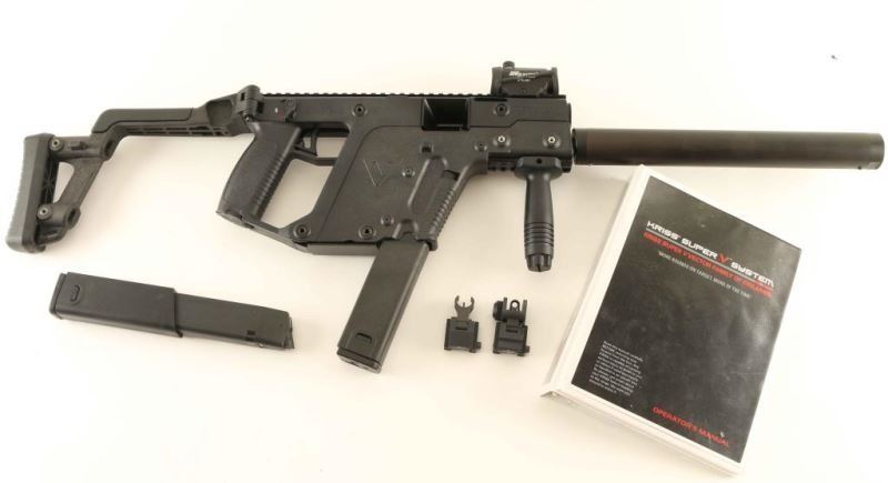 SN: TDIC01165 Innovative delayed blowback operated semiautomatic carbine chambered in .45 Auto & built by Transformational Defense Industries in Virginia Beach, Virginia circa 2009. The Vector uses the KRISS Super V Recoil Mitigation System which redirects recoil energy downward, reducing muzzle climb up to 95% and felt recoil up to 60% when compared to traditional weapon designs. It features a 16" barrel with faux suppressor barrel shroud, full-length scope rail, Sig Sauer STS-081 red dot sight, vertical foregrip, smooth trigger, ambidextrous safety, folding charging handle, push button magazine release, 30 round extended magazine, black polymer upper with integral pistol grip & battery storage compartment and an adjustable side folding shoulder stock. Includes the original factory cardboard box with factory folding sights, a spare 30 round magazine and a three rind binder with the manual, allen wrenches & other documents. The bolt and the barrel shroud show some finish wear. Action is sound, bore is excellent and the polymer is fine. Condition is near NRA Excellent. ***Modern Firearm***