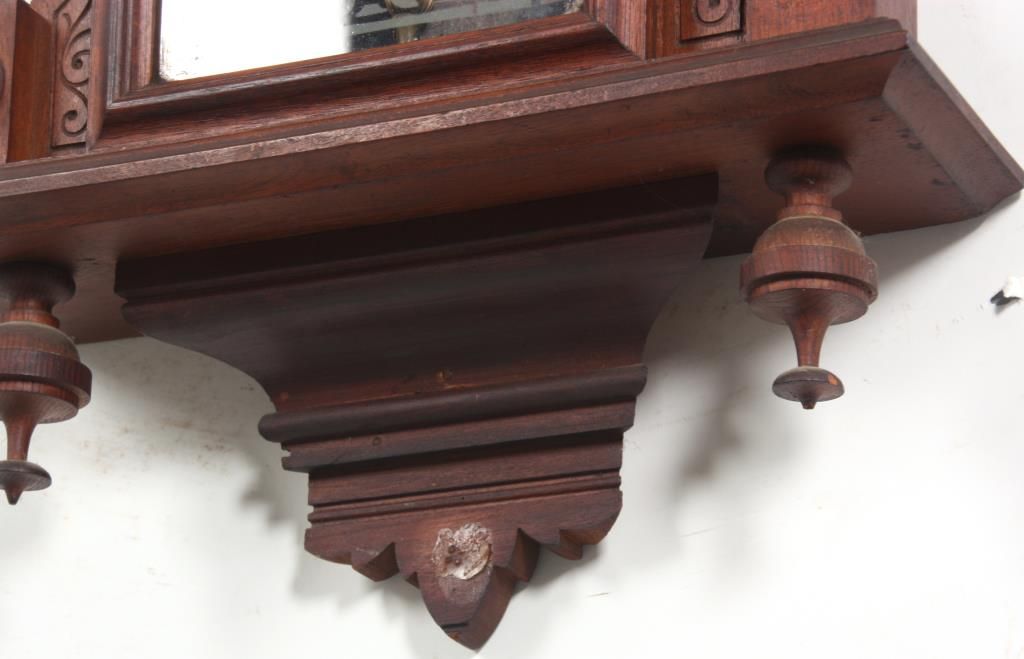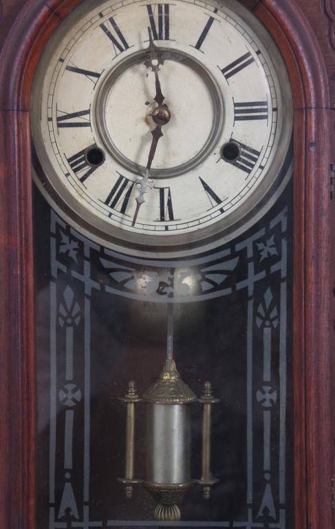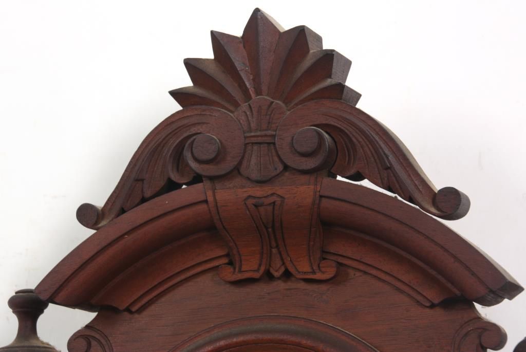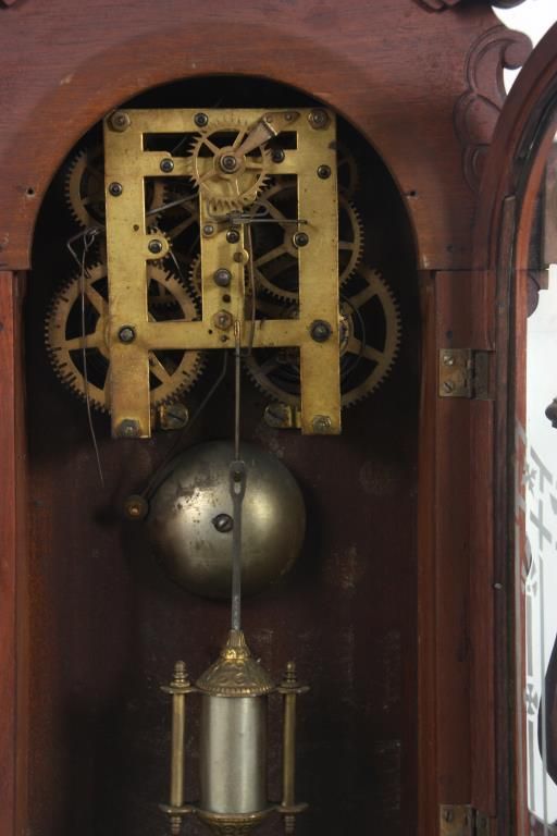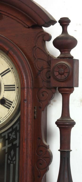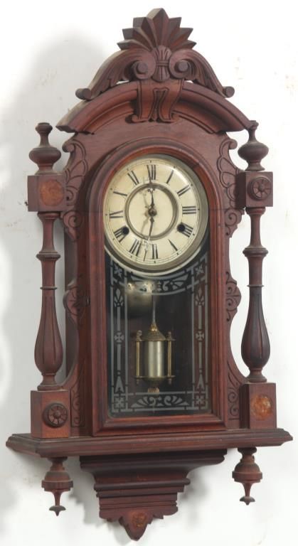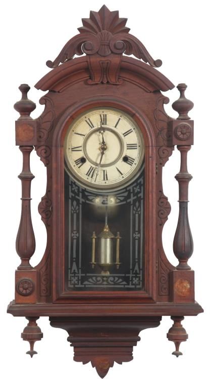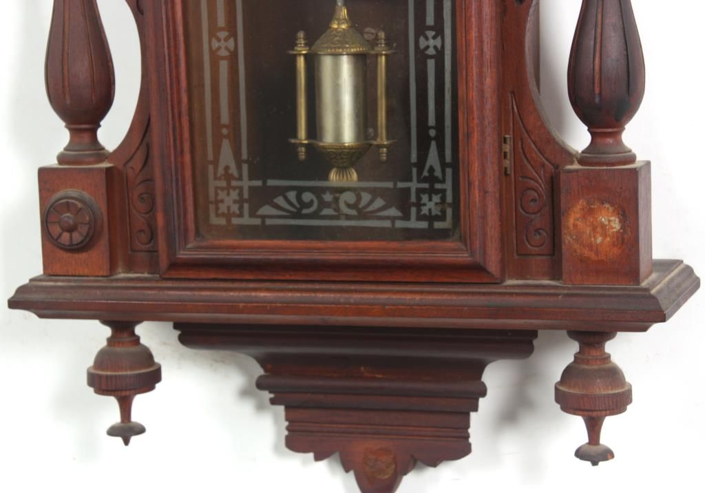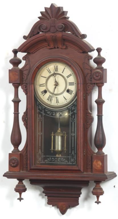 Kroeber Carved Walnut Wall Clock. 6 in. painted metal dial has black Roman hour numerals, minute hand is repaired; pierced brass spring driven movement has count wheel hour strike mechanism, steel bell and 1 jar brass pendulum. In a carved walnut case with scrolling filigree on the arched crest, turned side columns with top finials and teardrop finial and rosettes on the front, door glass has an arched top and reverse decorated design on the glass. Missing 2 rosettes on the columns. 27 in. high x 14 in. high x 4.25 in. deep.