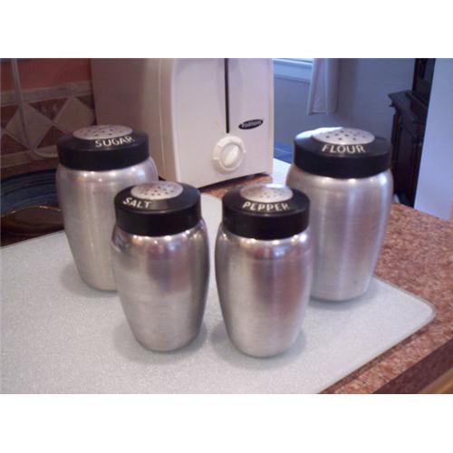 </font></strong>This is an aluminum range set made by Kromex. It contains a salt, pepper, sugar & flour shaker. There are minor scratches to the aluminum but this set is in very good condition for it's age. I don't see any cracks or major dings. The paint on the lettering is good but this may have been touched up at some point. This is a hard set to find because the Flour and Sugar shaker do not turn up often. So if you love the aluminum look, here's your chance to buy a classic. </font>