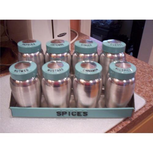</font></strong>This is a set of eight spice containers and rack that is accented in aqua and made by Kromex. The shakers are named on the lids. They read Cinnamon, Cayenne, Mustard, Allspice, Paprika, Ginger, Cloves, and Nutmeg. Each shaker measures 4.25" tall. They all have metal inserts with holes. The rack measures 10"x3"x5".25". There is very little scratching and all the inserts are present. The lettering is unfaded and is the original as far as I know. The only flaw I can find are two teensy chips on the corners of the top of the allspice shaker. I've tried to show it in the pictures. I don't see any dents or dings to the metal. There is some wear to the rack from the spice tins sitting there for many years. It can sit on a counter or be mounted on the wall. It is marked Kromex. I haven't seen one this good in a very long time. This Kromex aqua spice set is very sought after by aluminum and kitchen collectors; and it would look so great in a retro kitchen. </font>