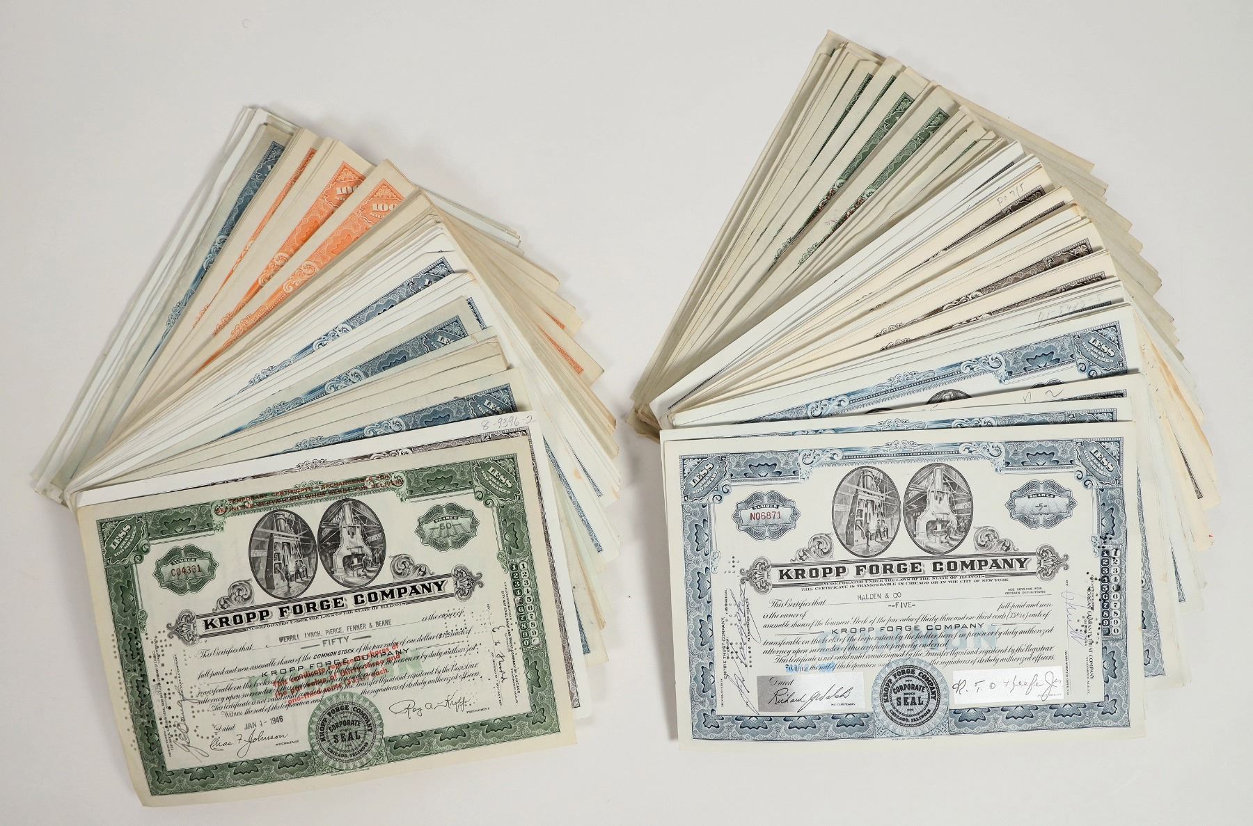 Approx more 200. All I/C. Issued 1941-67. Kropp Forge Co. Stocks , VG or better cond. Northern BNC printer.