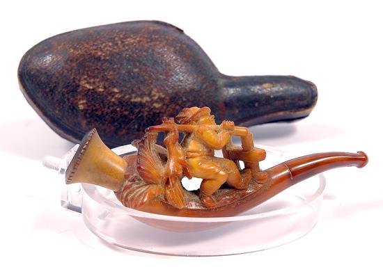 Kruger, Otto - Used Meerschaum Pipe. 4 in. long; bowl is ¾ in. across. Used. The pipe is in the shape of a hunting horn atop of which is carved a hunter on his way home carrying a rabbit and a brace of pheasants. Amber lucite stem. In original scuffed burgundy leather case which has a coat of arms and "Best Quality Vienna Meerschaum" written in German.