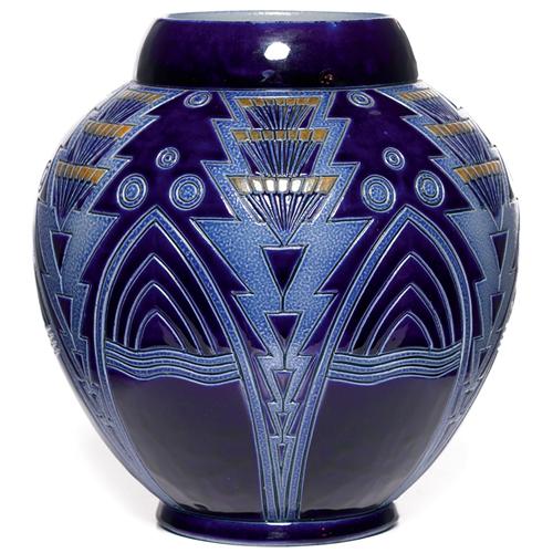 Exceptional Krumeich-Remmy vase, broad bulbous form with incised stylized geometric designs in light blue and brown against a deep blue ground, impressed mark,8in.h, nice design