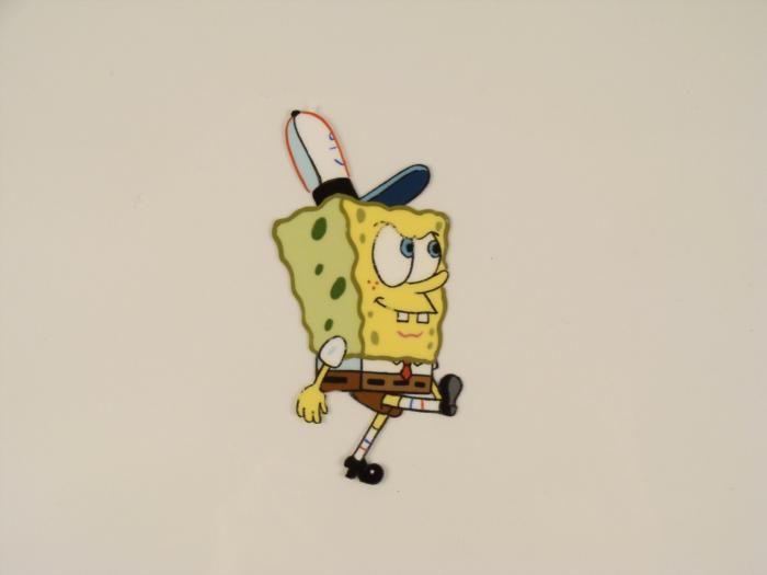 This original animation cel is from the Nickelodeon TV show SpongeBob Squarepants. The story takes place under the deep blue sea in Bikini Bottom, where SpongeBob resides. SpongeBob, who is a yellow, porous sponge, is your typical happy-go-lucky character, as he is always cheerful and enjoys making people laugh. Patrick Star, SpongeBob's neighbor who is a starfish, is your average children's show idiot, as he boasts knowing nothing and is often getting himself into ridiculous situations. Between the homes of these two lies the home of the miserable Squidward, a squid, who is known for being grouchy and playing tricks on SpongeBob and Patrick. Both SpongeBob and Squidward work at the Krusty Krab, a fast food business run by the greedy money-loving Mr. Krabs, a crab, the arch rival of the evil, possibly misunderstood, Plankton. Another neighbor, Sandy Cheeks, an athletic squirrel who normally wears an astronaut's space suit, was introduced in "Tea at the Treedome." She spends most of her time inventing and experimenting. SpongeBob is walking with his Krusty Krab hat on.Original Production Animated Cel Overall Size of Cel: 10 1/2" x 12 1/2" Very Good ConditionThis is an original hand-painted cel set-up used in the production of an episode of "SpongeBob SquarePants." Each one-of-a-kind set-up represents a slight change in position of the characters. When individually photographed and projected in rapid succession, the images appear to move.