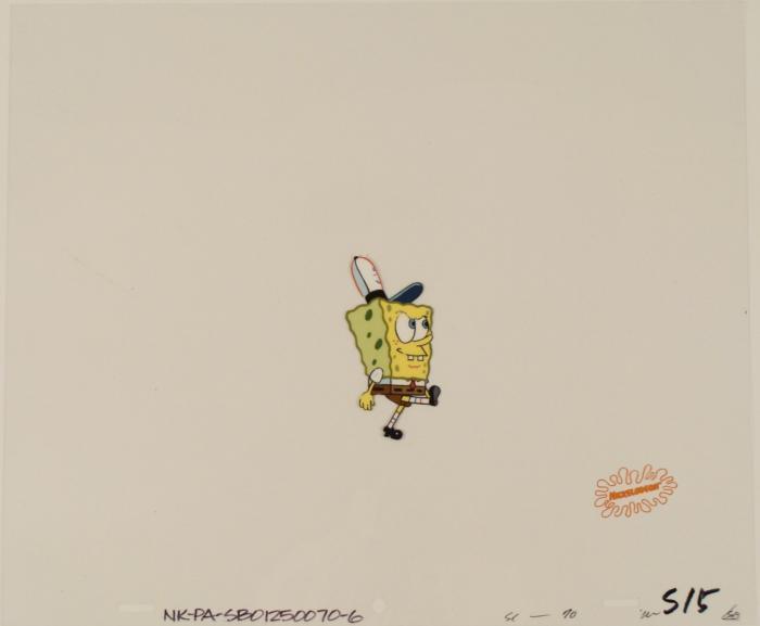 This original animation cel is from the Nickelodeon TV show SpongeBob Squarepants. The story takes place under the deep blue sea in Bikini Bottom, where SpongeBob resides. SpongeBob, who is a yellow, porous sponge, is your typical happy-go-lucky character, as he is always cheerful and enjoys making people laugh. Patrick Star, SpongeBob's neighbor who is a starfish, is your average children's show idiot, as he boasts knowing nothing and is often getting himself into ridiculous situations. Between the homes of these two lies the home of the miserable Squidward, a squid, who is known for being grouchy and playing tricks on SpongeBob and Patrick. Both SpongeBob and Squidward work at the Krusty Krab, a fast food business run by the greedy money-loving Mr. Krabs, a crab, the arch rival of the evil, possibly misunderstood, Plankton. Another neighbor, Sandy Cheeks, an athletic squirrel who normally wears an astronaut's space suit, was introduced in "Tea at the Treedome." She spends most of her time inventing and experimenting. SpongeBob is walking with his Krusty Krab hat on.Original Production Animated Cel Overall Size of Cel: 10 1/2" x 12 1/2" Very Good ConditionThis is an original hand-painted cel set-up used in the production of an episode of "SpongeBob SquarePants." Each one-of-a-kind set-up represents a slight change in position of the characters. When individually photographed and projected in rapid succession, the images appear to move.