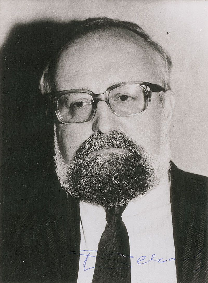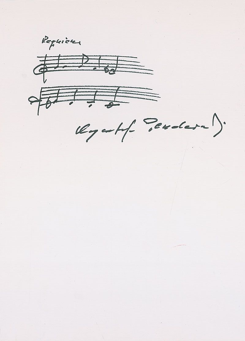 Polish composer and conductor (b. 1933) considered to be Poland's greatest living composer. Two items: AMQS on an off-white 8.5 x 11 sheet, with Penderecki penning two bars of music from his ‘Requiem,’ and signing under the quote; and a glossy 5.25 x 7 photo, signed in blue ballpoint. Some light spotting to finish of photo as well as some mild contrast to parts of signature, otherwise fine condition. Accompanied by the original mailing envelope.