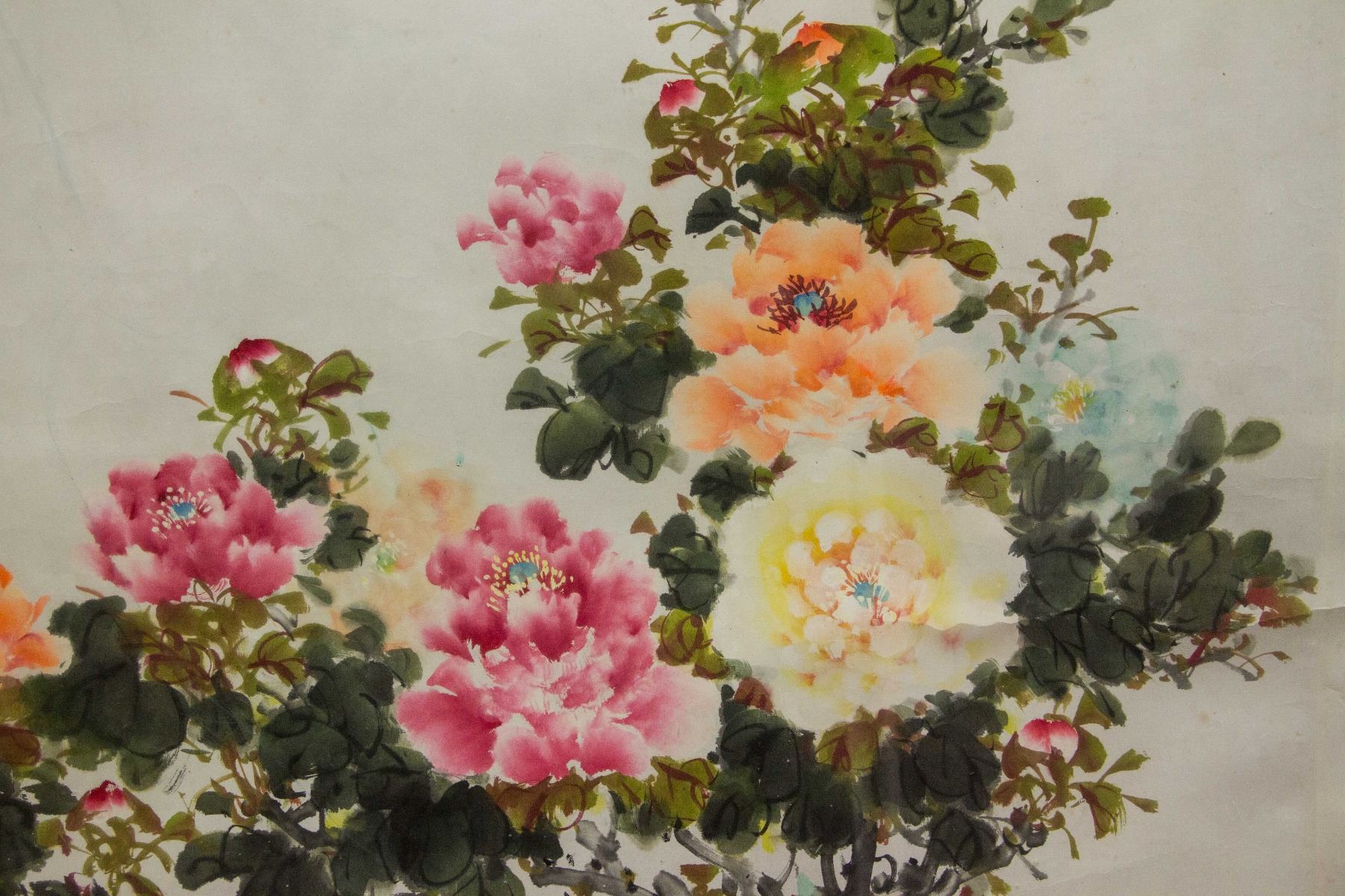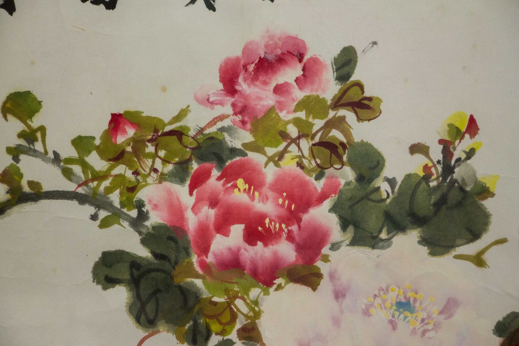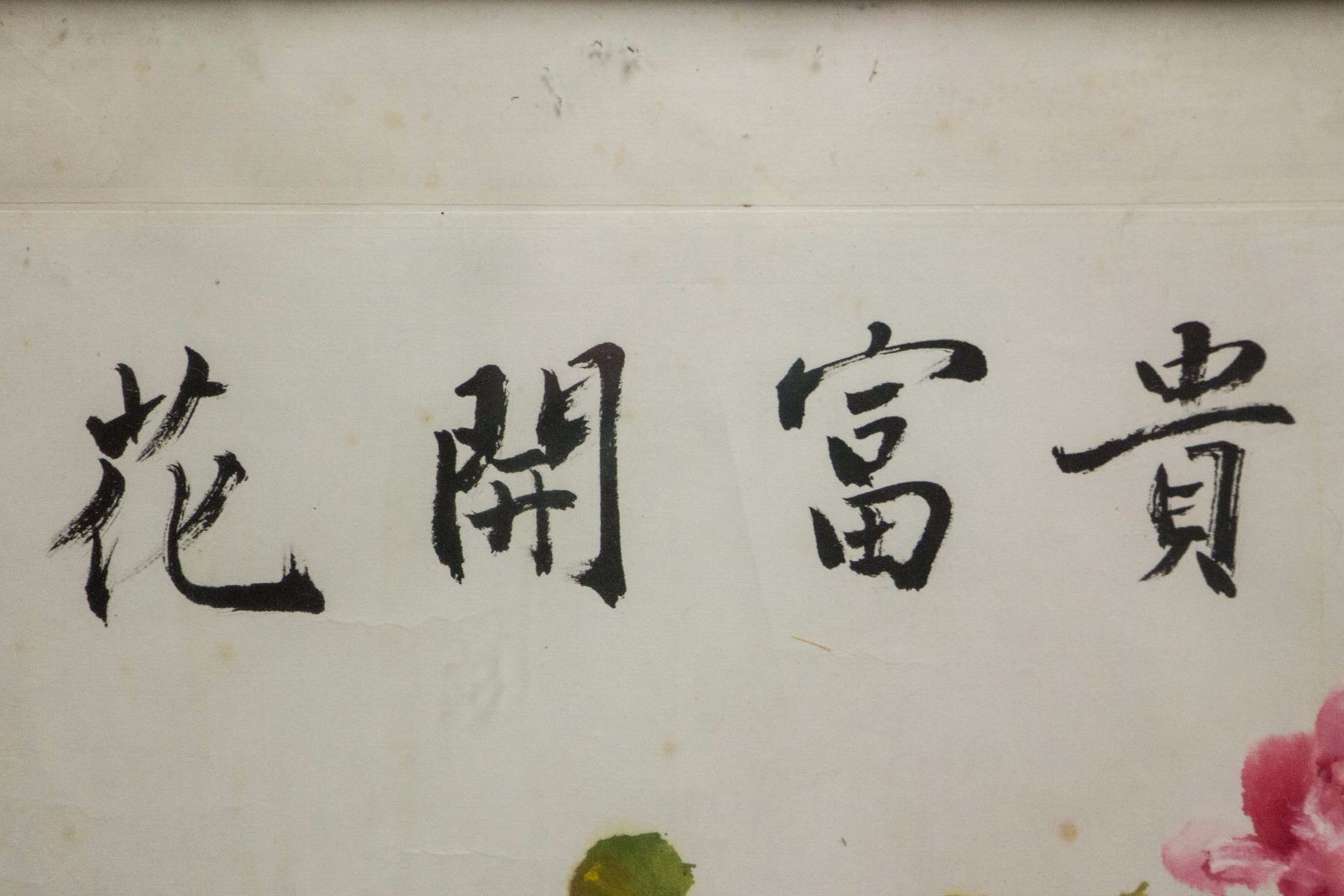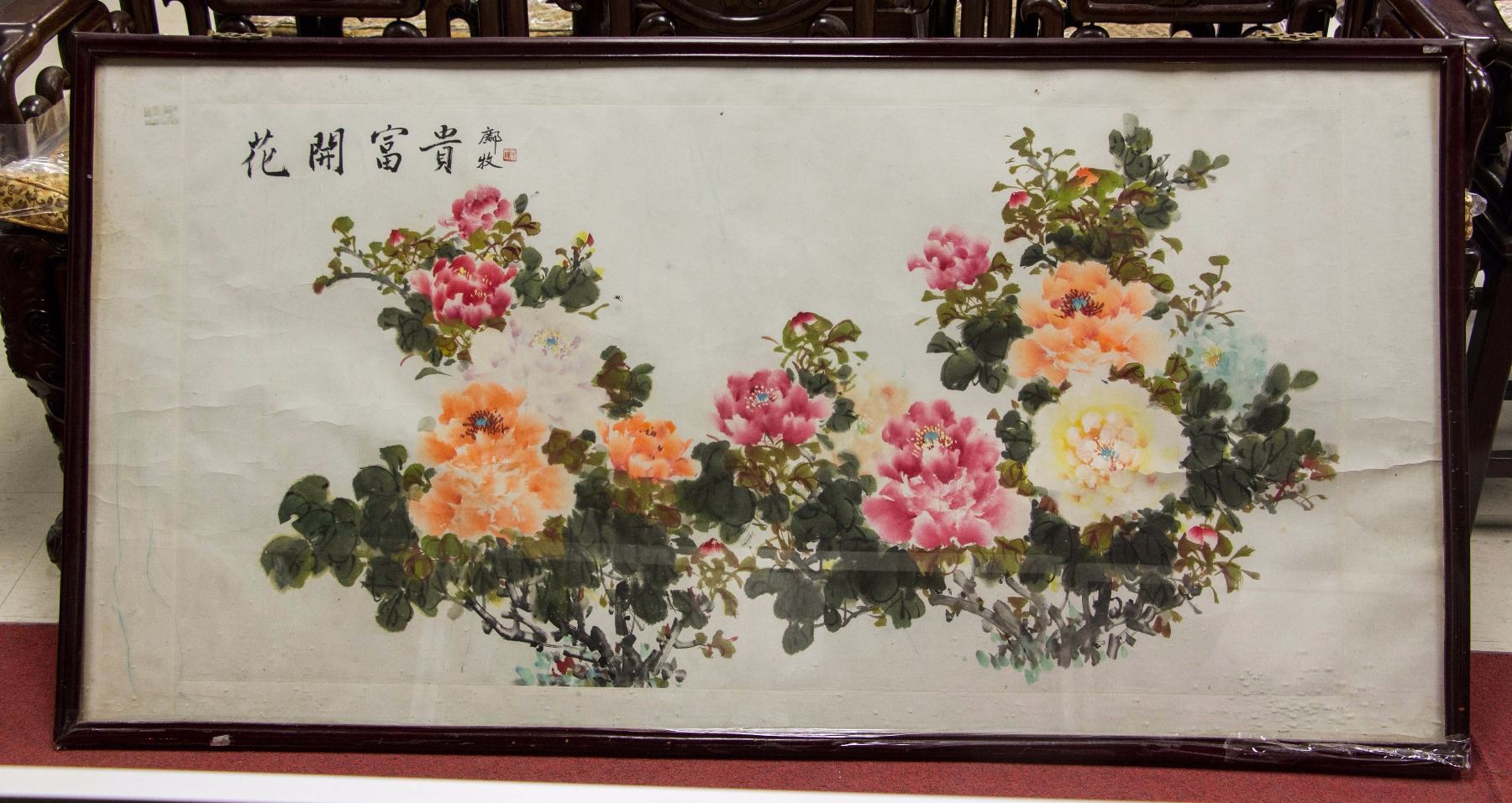 Painting of peony flowers; Chinese ink and watercolour on paper; framed; signed Kuang Mu, Chinese artist; inscribed with 1 artist seal; 68 cm x 136 cm