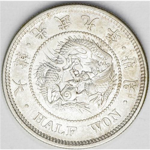 <B>Kuang Mu silver 1/2 Won year 9 (1905),</B></I> KM1129, lustrous AU with a hint of toning.