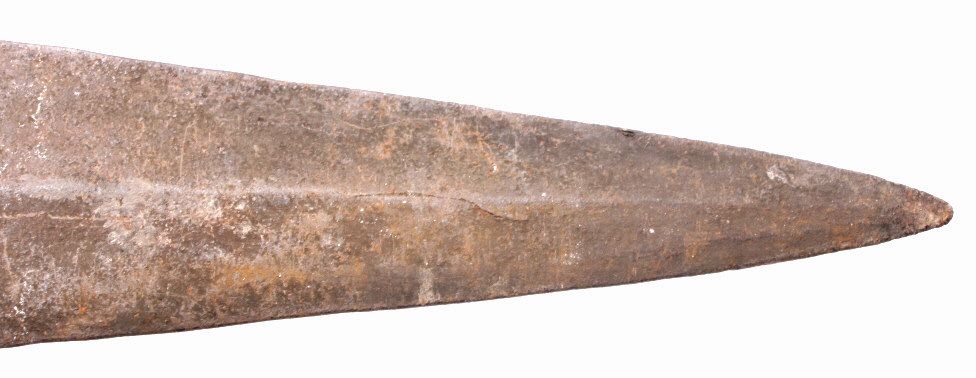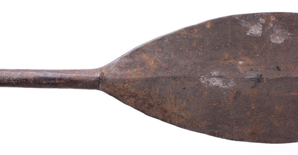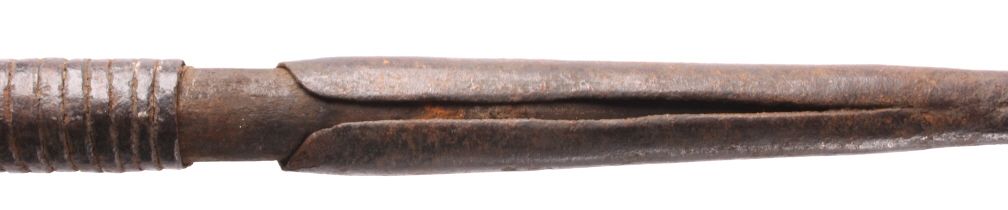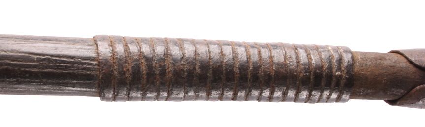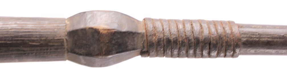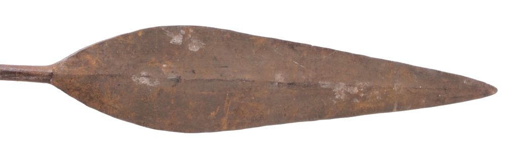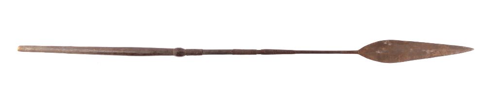 This is from the Kingdom of Congo a tribe that ruled the west central Africa. The Spear is hand made with a forged double edged spearhead. This piece dates older than 1890's and the exact age is unknown. Measures 57"long with a 14" long spear head and 3" wide.