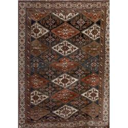 Having a diagonal stepped medallion field enclosing floral sprays and birds on variegated grounds within a rosette
