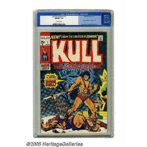 <B>Kull the Conqueror #1 (Marvel, 1971) CGC NM/MT 9.8 Off-white pages.</B></I> After Conan became a smash success, Marvel gave Robert E. Howard's Kull a one-issue try-out in " "<B>Creatures On The Loose</B></I>, and shortly thereafter the man from Atlantis got his own series. Marvel started things off by telling the character's origin story. Ross Andru and Wally Wood drew the story, and Andru teamed up with Marie Severin for the cover. Overstreet 2005 NM- 9.2 value = $50. CGC census 9/05: 9 in 9.8, none higher. <BR><BR><B>Important notice:</B> Heritage usually auctions material at the rate of 200-250 lots per hour. On some occasions eBay Live bid software or the Internet may not be able to keep up with the pace of the auction. We recommend placing a realistic absentee bid now as insurance to avoid disappointment. Occasionally the auctioneer may eliminate or reject an eBay Live bid, and the auctioneer may also reopen a lot after the close of the eBay live bidding (usually because we missed an audience bid), and may reject your bid even if it shows you as the winning bidder. By bidding via eBay Live, you agree that Heritage may award the lot to another bidder at its sole discretion under the circumstances described above or any other reasonable circumstances. Since eBay bids are not shown to us until we open the lot on the floor, we treat those bids just like floor bids. In most cases the floor responds before the eBay bid is presented to us, due to Internet lag time, so for consistency we have made it a policy that floor bids are always considered first over tie eBay live bids. Also please note that all Heritage lots purchased through eBay Live carry a 20% Buyer's Premium. Please make sure you read the Terms and Conditions before you bid. This lot is being auctioned in conjunction with a live floor auction by Heritage Galleries & Auctioneers. All final auction and invoice information will be supplied by Heritage Galleries & Auctioneers, and all other information sho