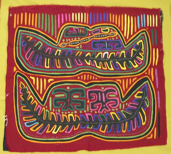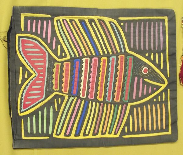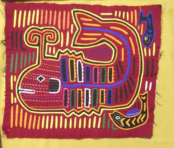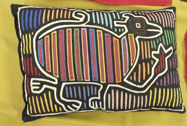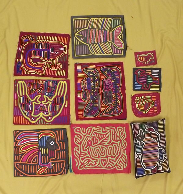 Kuna Indian 10 Fabric Molas and Pillow, pillow measures 15'' x 10'' and largest panel is 15'' x 17'', hand sewn from the San Blas Island in Panama, Molas are made by members of the Kuna Indian culture, who live in parts of a mainland strip in northwestern Colombia and on the islands of San Blas in Panama. Traditionally, molas are manufactured by Kuna women and no two molas are the same. They embody an entire philosophy and are a well-preserved tradition. Kuna women wear them every single day of their lives and are even buried in them. Mola designs do not only reflect great natural and artistic wisdom, but also elements of a very original culture. Molas are made by hand with reverse-applique needlework. Two or more layers of cloth are stitched together so that the design shows through openings in the layers. The design is inspired by shapes and figures from the world that surrounds them..