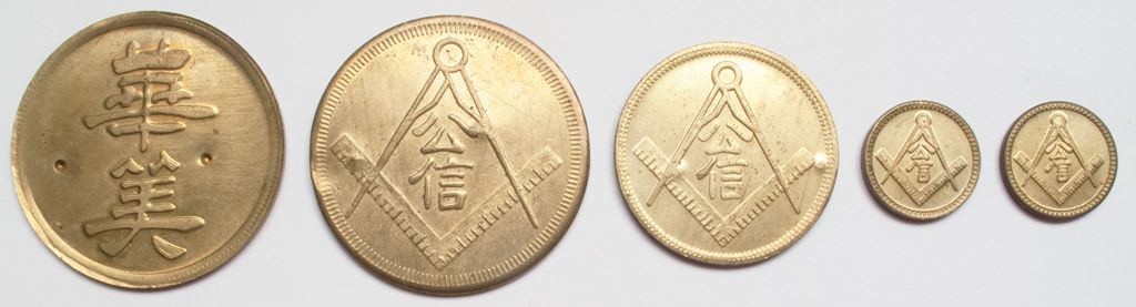 Masonic Club and Chinese American Club game counters. Three different sizes for Kung Sun Club and one large Wha Mei counter. Total of 5.City: PortlandCounty: State: ORDate: