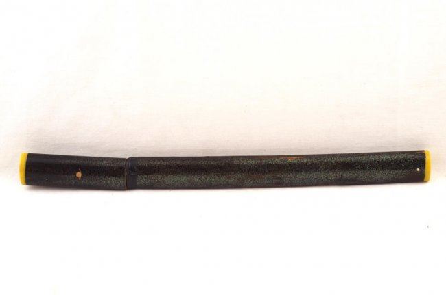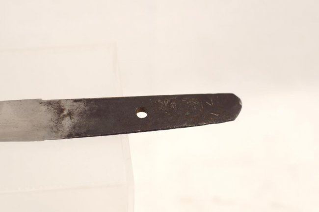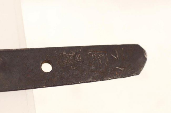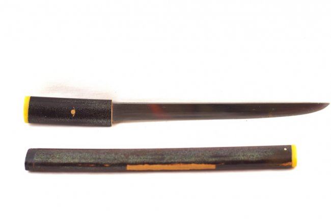 Kunitomo, a Kamakura period swordsmith. Eldest son of Kuniie, founder of the Kyoto-based Awata-guchi school of swordsmithing. He is said to have served as an official Imperial court swordsmith for Emperor Go-Toba around 1207-1211. Tang shows KuniTomo mark - blade measures 11" newer handle and sheath 17" overall. Provenance: from the collection of George Welch, internationally known authority and collector of Japanese swords