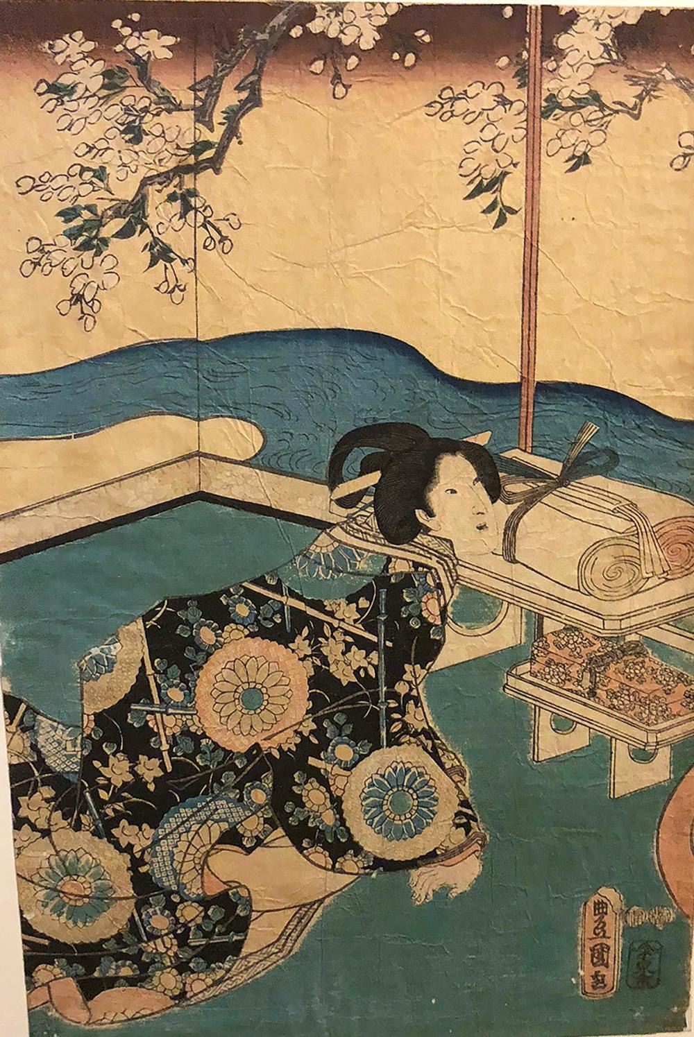 Kunisada - "Kneeling Woman" Japanese Woodblock Print. Fine condition, mounted on rice paper, 9 x 14