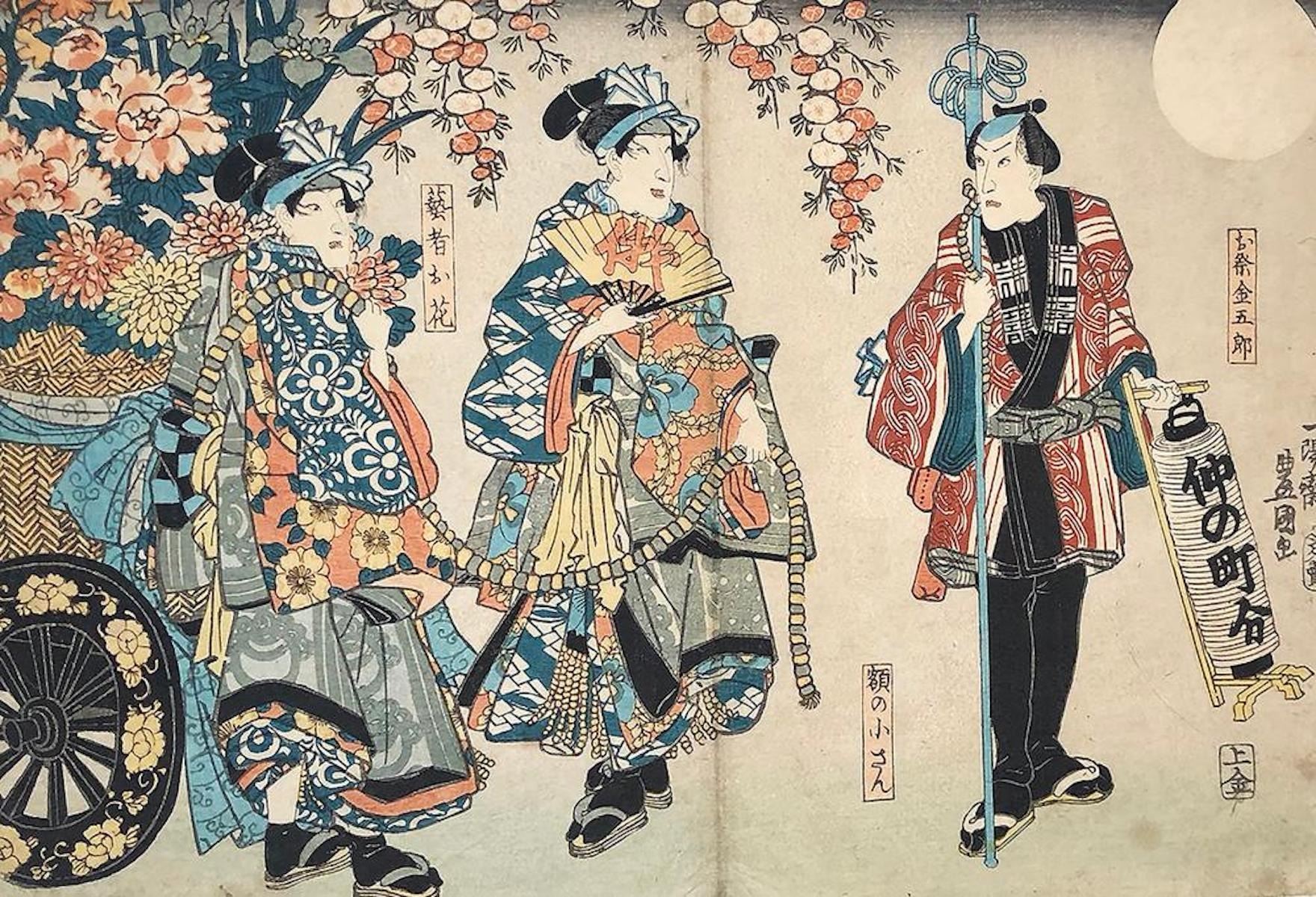 Kunisada - "Two Women with a Man in Conversation"- Japanese Woodblock Print, some aging, otherwise fine condition, 14 x 9.5
