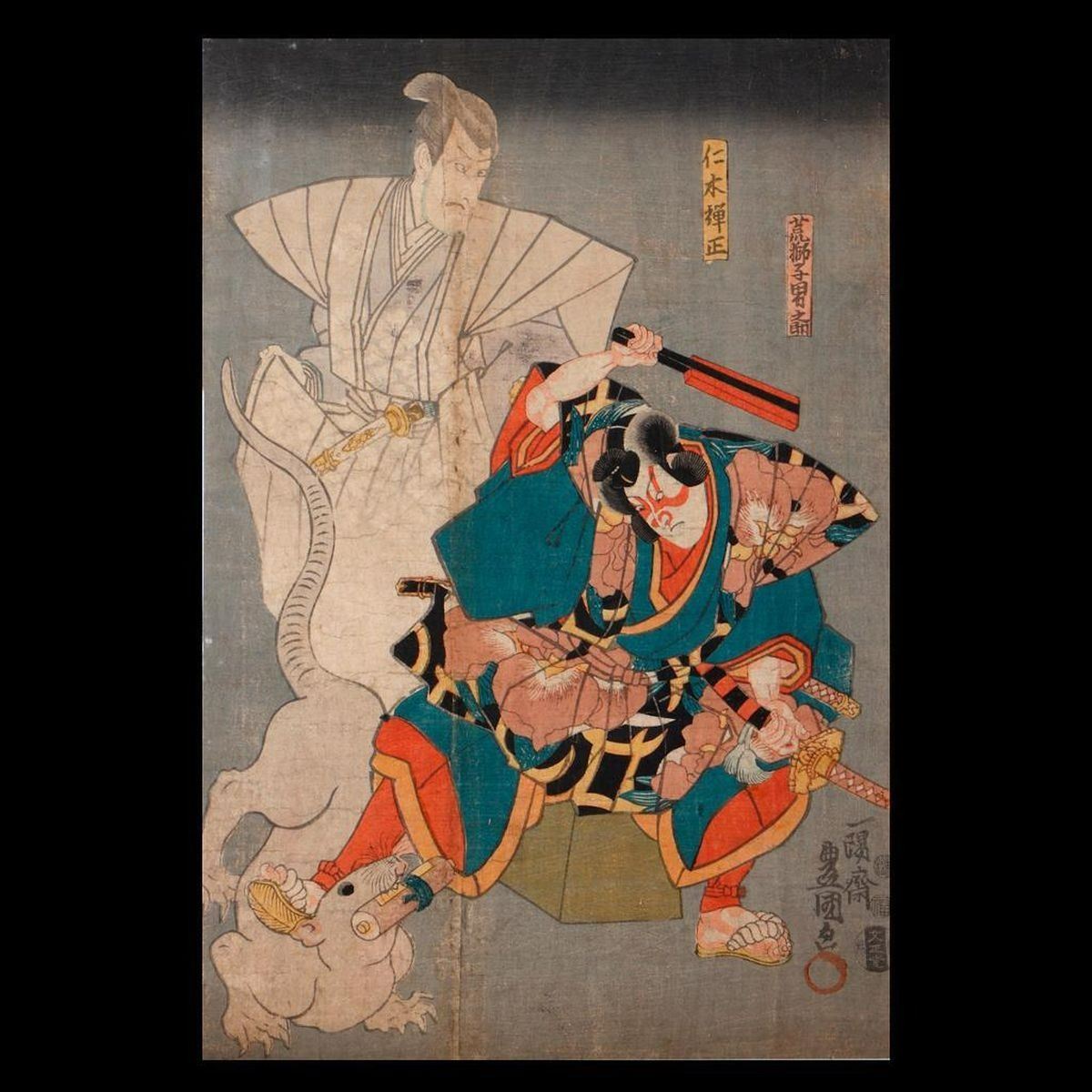 Artist : Kunisada UTAGAWA, Toyokuni III (1786-1865) Series : Date Zensei Sakura no Iromaku Date : (c.1849) Medium: Woodblock Dimensions : 14 x 9 1/2 in. each. Condition : Backed, stained, rubbed,and faded.
