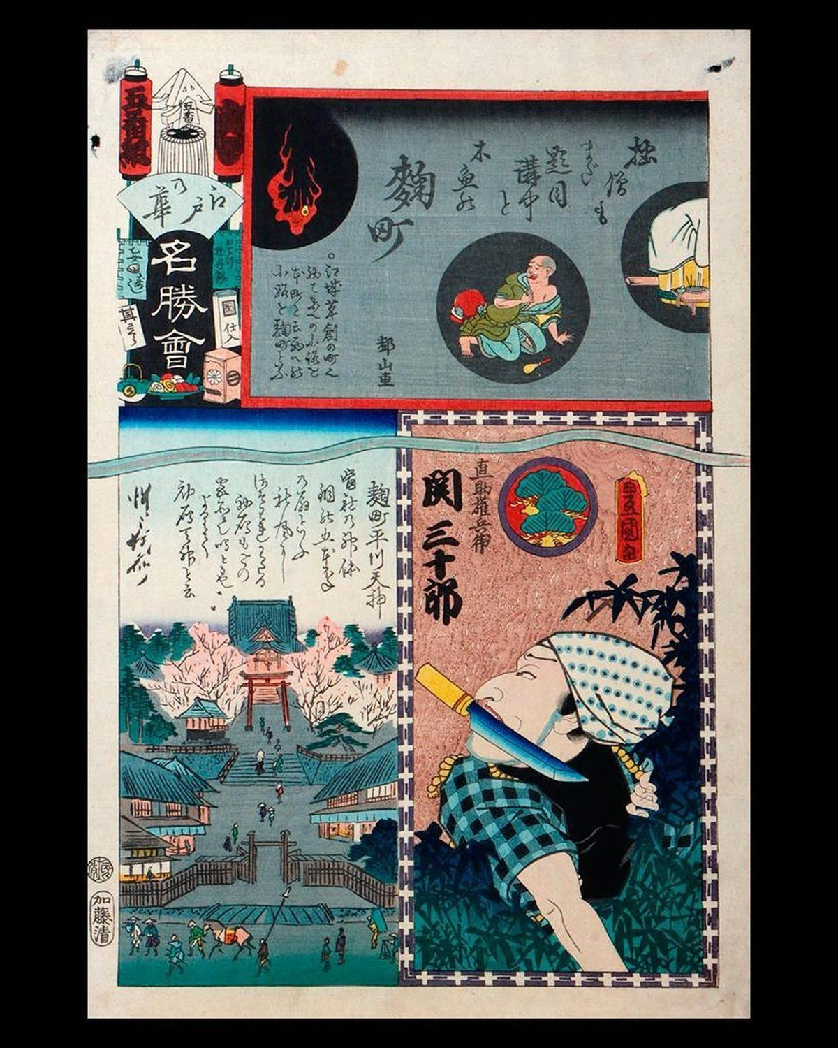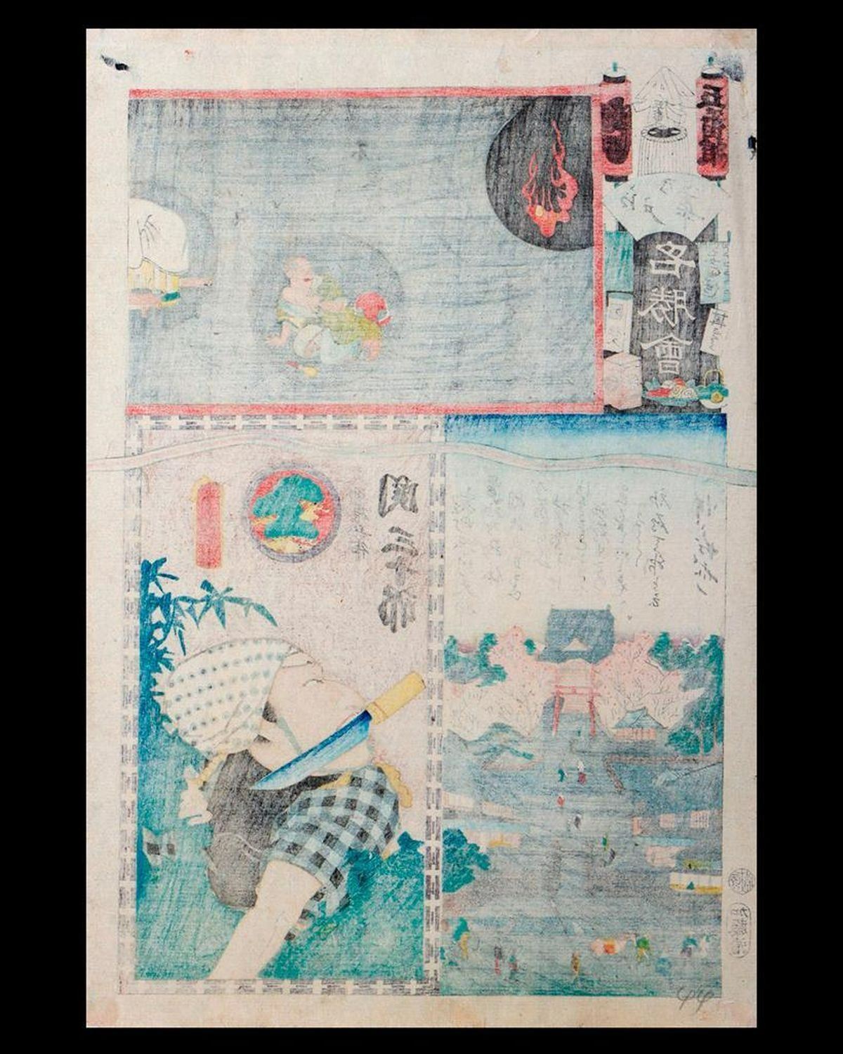 Artist : Kunisada UTAGAWA, Toyokuni III (1786-1865) Series : Ghost Head. (Flowers of Edo and Views of Famous Places) Date : (c.1863) Medium: Woodblock Dimensions : 14 x 9 1/2 in. each. Condition : Stained, backed, rubbed, faded, and centerfold.