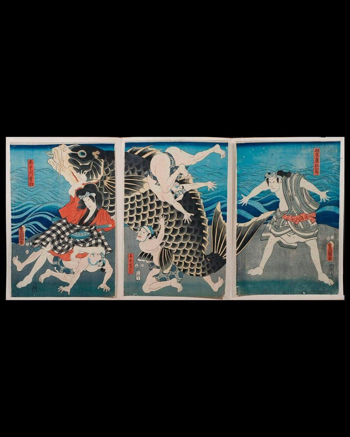 Artist :Kunisada UTAGAWA, Toyokuni III (1786-1865) Series :Ichikawa Ichizo III as Daiku Rokuzo in the play Koma Mukae Tanomi no Irikomi Date :(c.1858) Medium: Woodblock(triptych) Dimensions : 14 1/4 x 93/4 in. each. Condition :All backed and trimmed with small losses, faded and restoration.