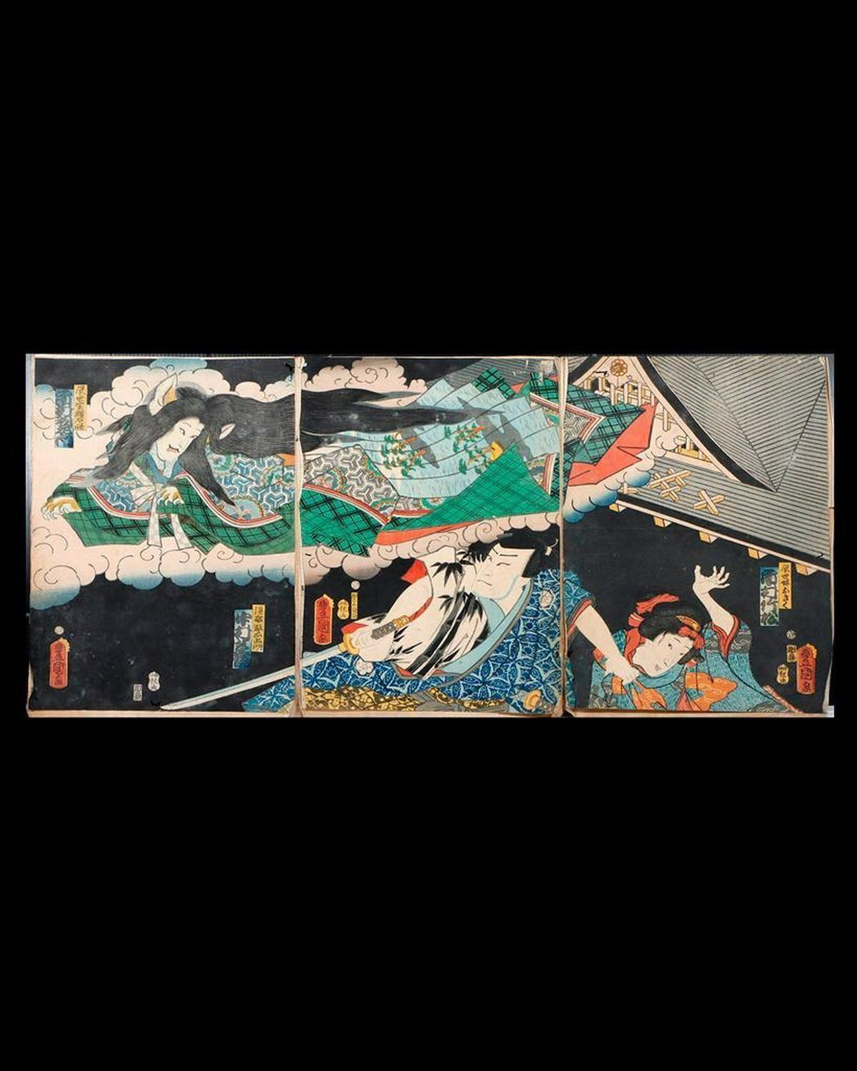 Artist : Kunisada UTAGAWA, Toyokuni III (1786-1865) Series : The Cat Witch Date : (c.1861) Medium: Woodblock(triptych) Dimensions : 14 1/4 x 9 3/4 in. Condition : Small holes, stained andfaded.