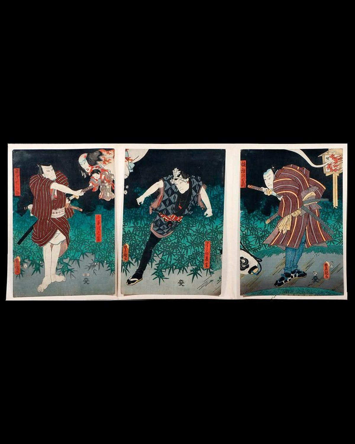 Artist : Kunisada UTAGAWA, Toyokuni III (1786-1865) Series : The Bloodied Ghost of Koheiji Date : (c.1853) Medium: Woodblock (triptych) Dimensions : 14x 9 1/2in. each. Condition : All backed,stained with small losses, faded.