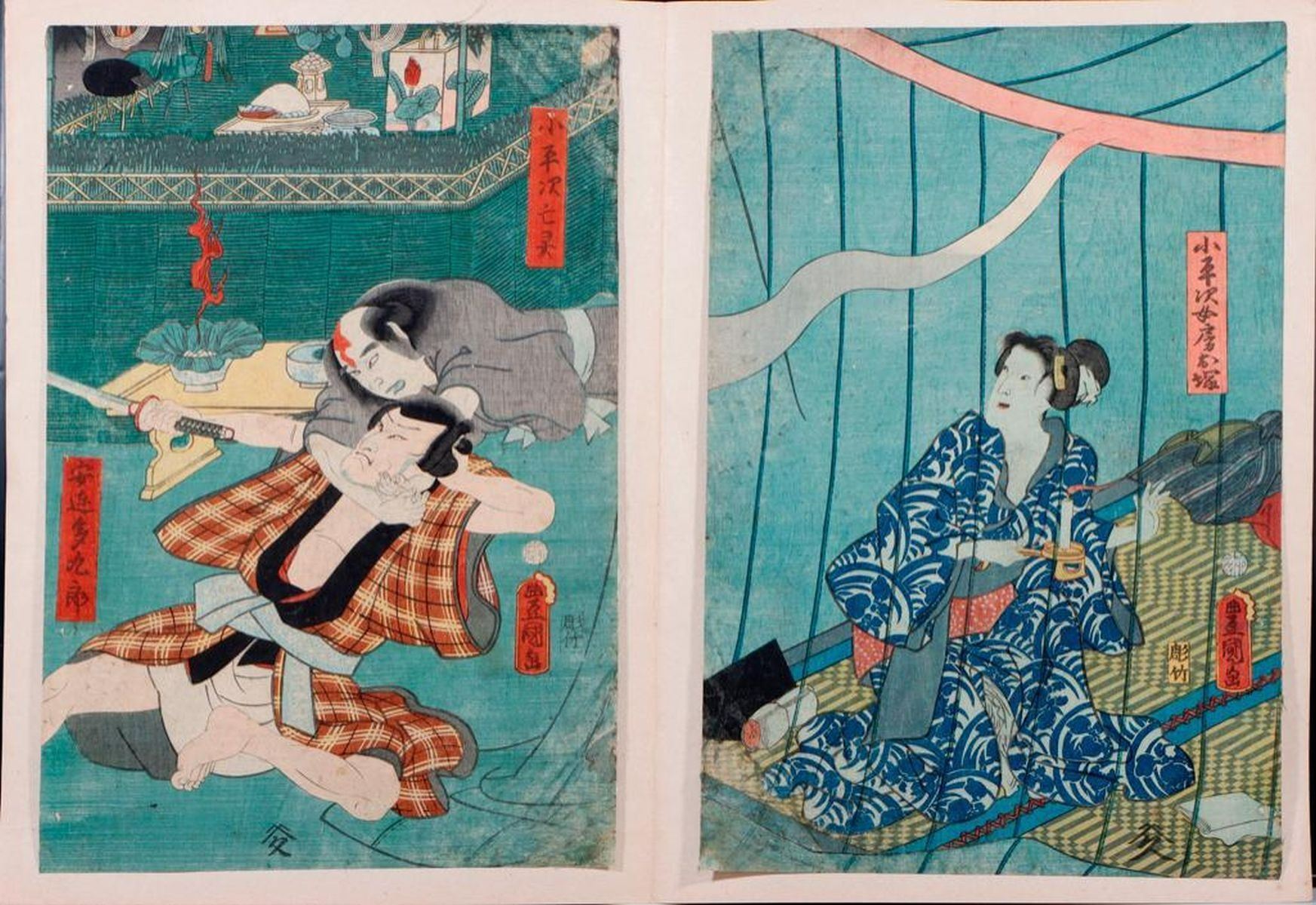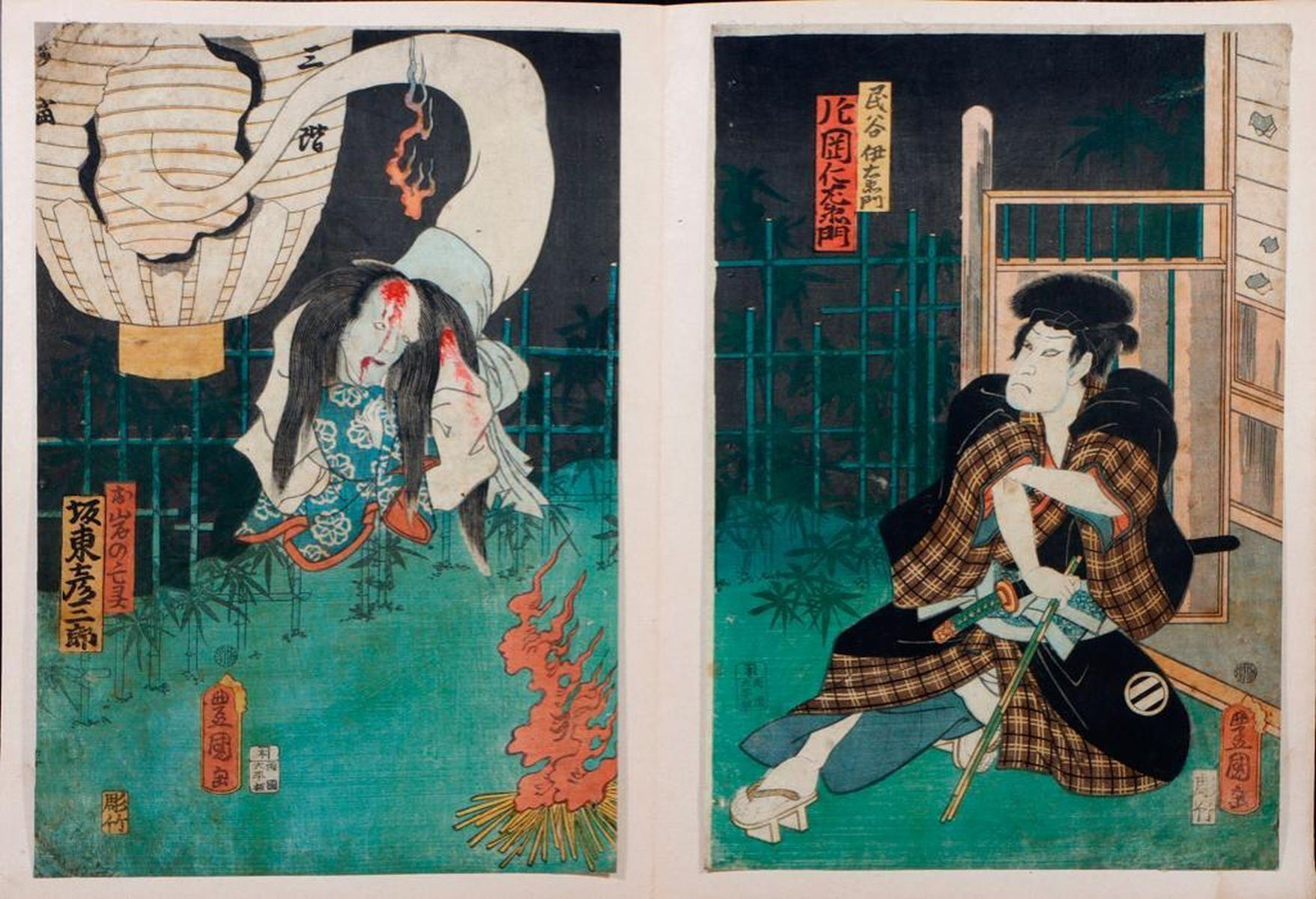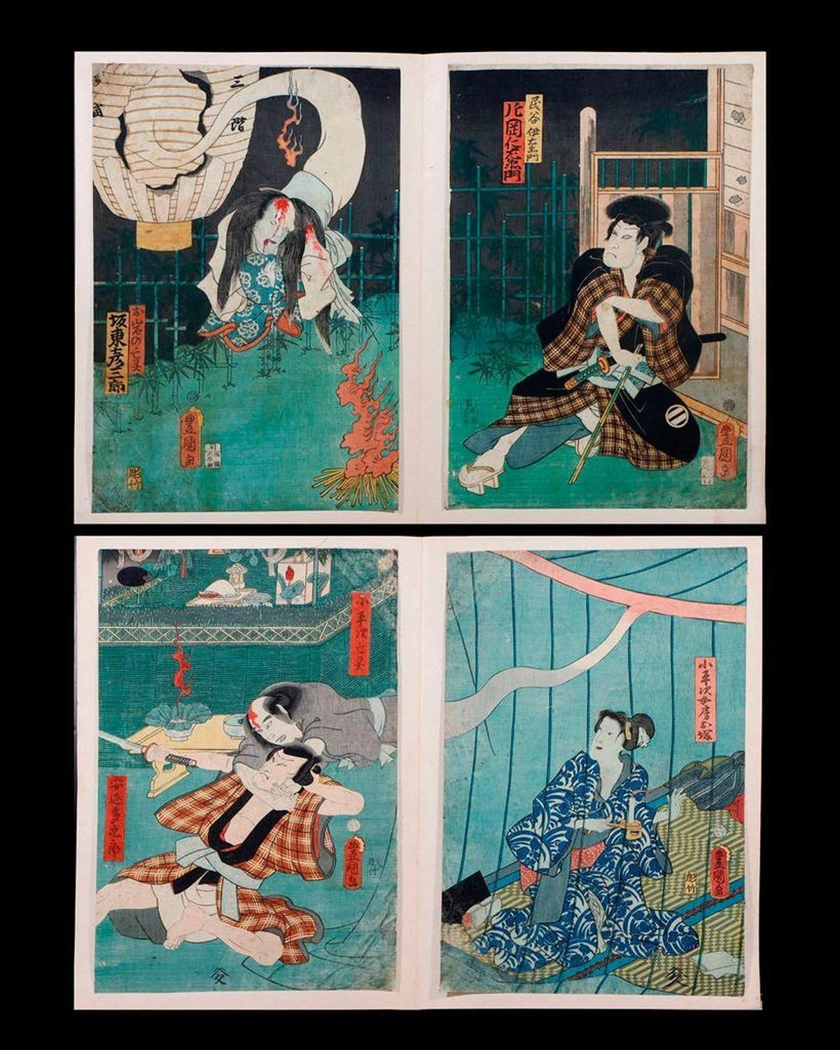 Artist : Kunisada UTAGAWA, Toyokuni III (1786-1865) Series : Ghost of Oiwaand other Date : (c.1859 and 1861) Medium: Woodblock (two diptychs) Dimensions : 14 x 9 1/4in. each. Condition : All backed, stained with small losses, faded.