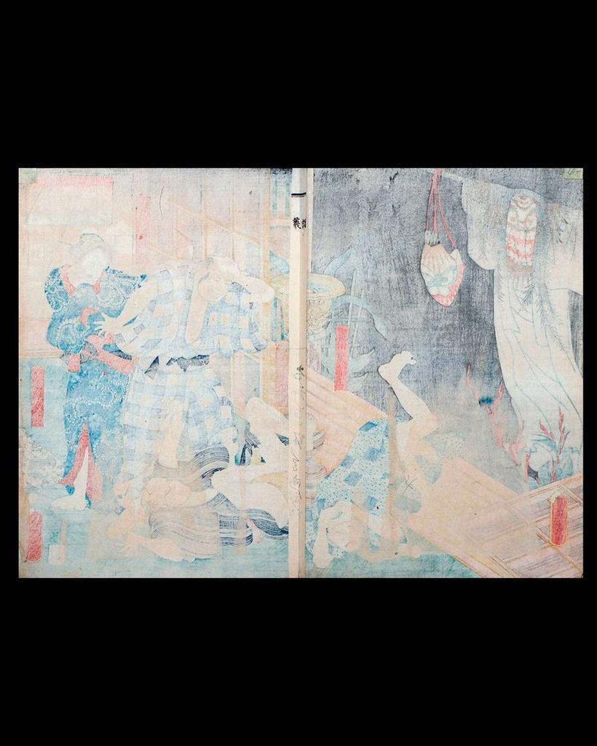 Artist : Kunisada UTAGAWA, Toyokuni III (1786-1865) Series : The Inn at FutakawaStation, from the Story of Shanks' Mare on the Tokaido Date : (c.1854) Medium: Woodblock (diptych) Dimensions : 14 x 9 1/2in. each. Condition : All backed, stained with small losses, faded.