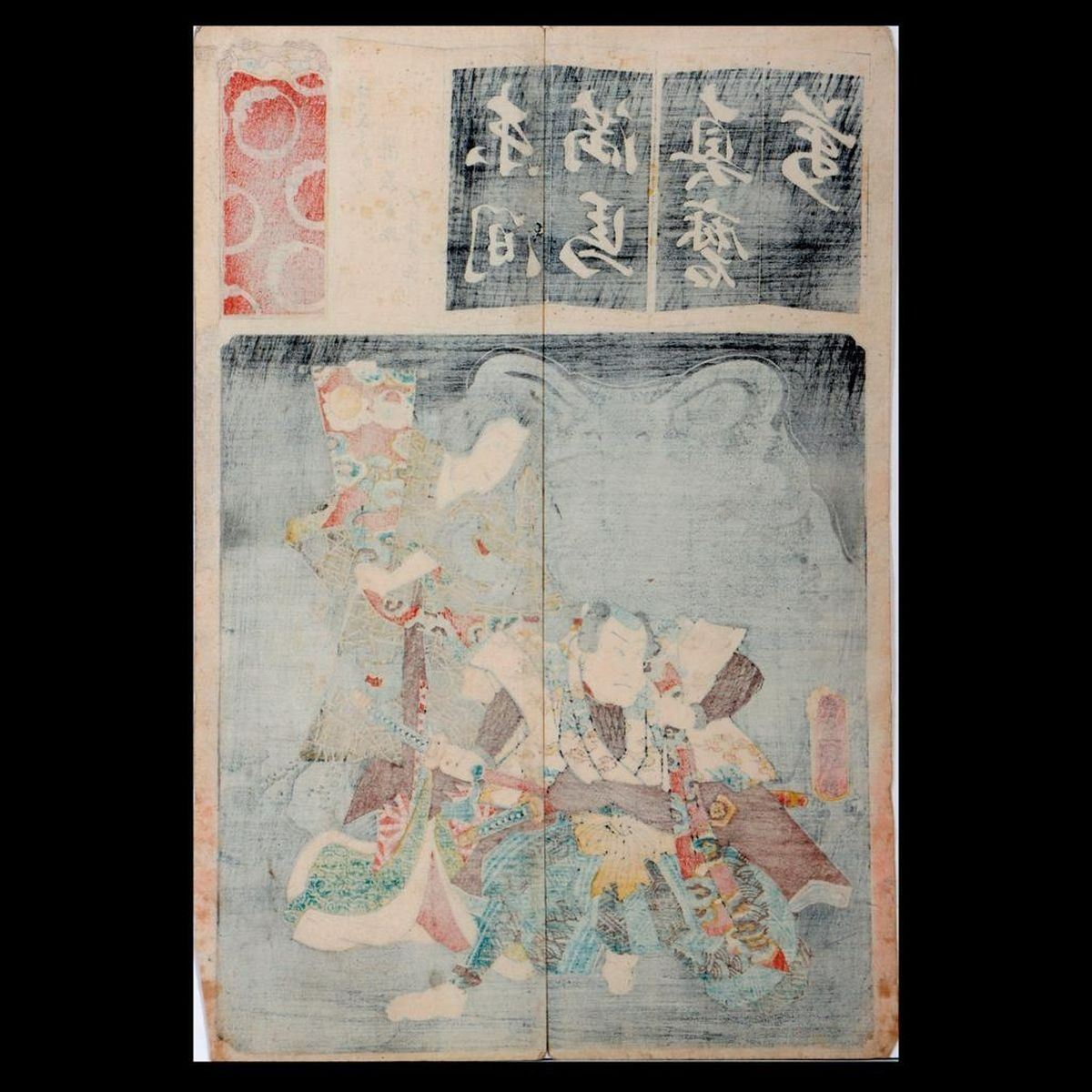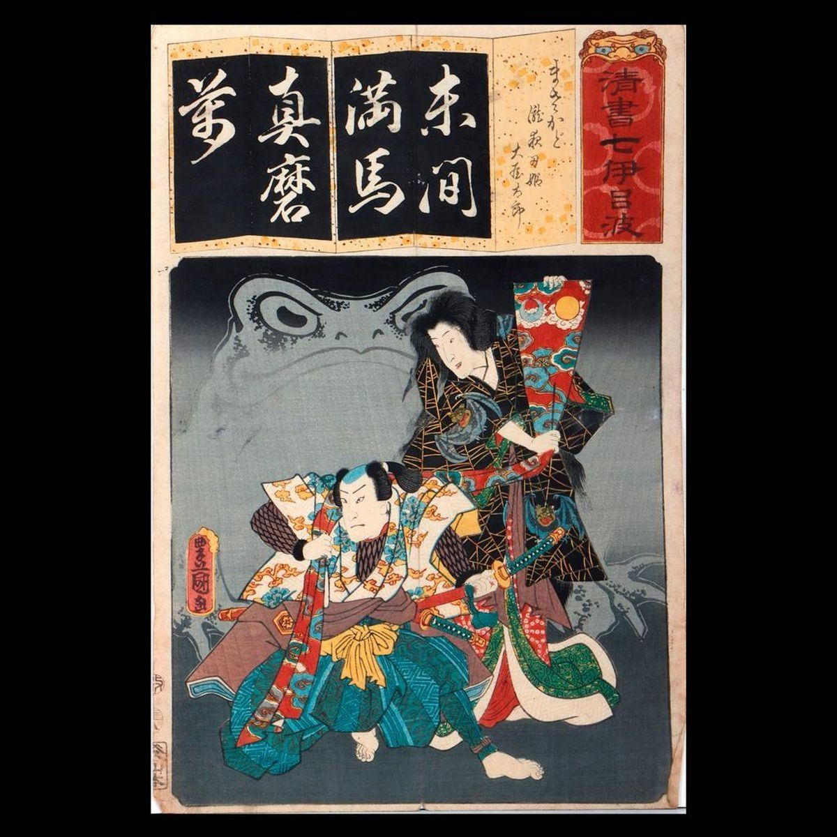 Artist : Kunisada UTAGAWA, Toyokuni III (1786-1865) Series : The wicked Princess Takiyashainvoking toad magic. Date : (c.1856) Medium: Woodblock Dimensions : 14 x 9 1/2 in. each. Condition : Stained, rubbed,faded, centerfold.