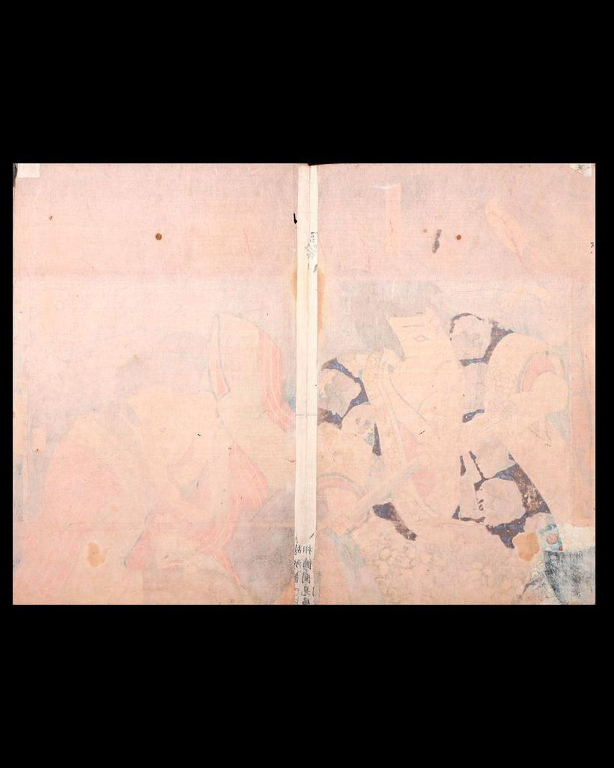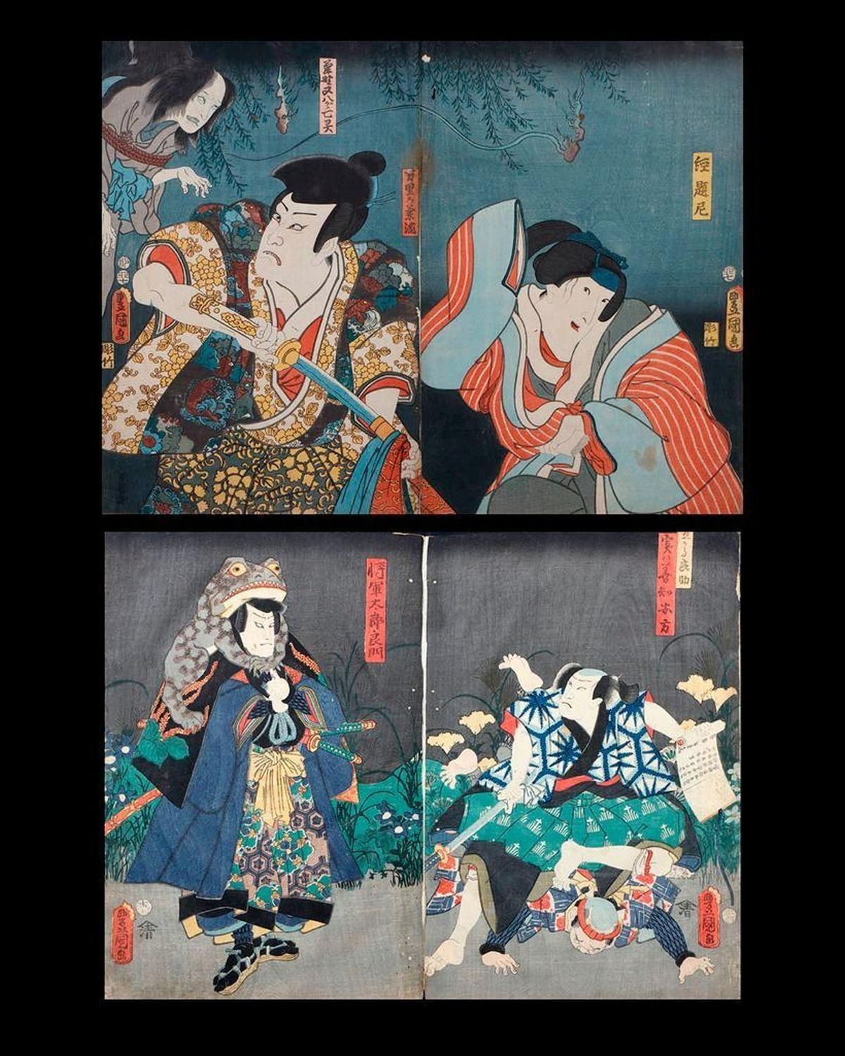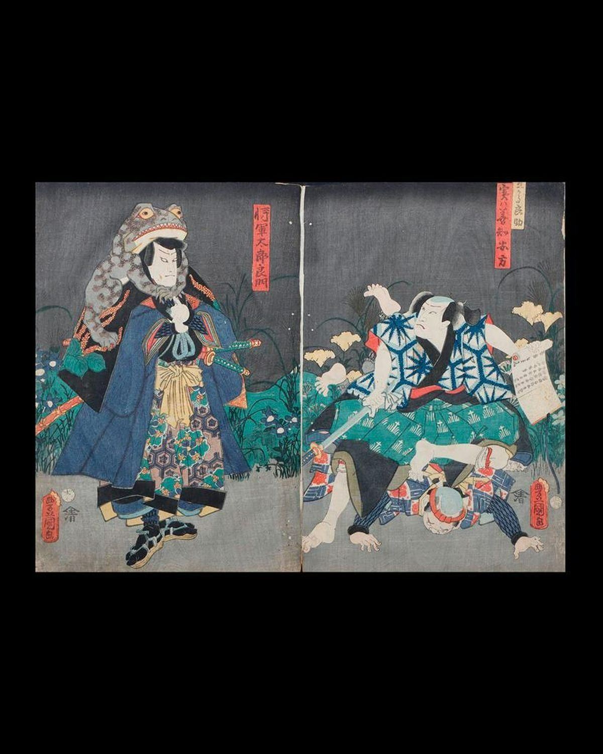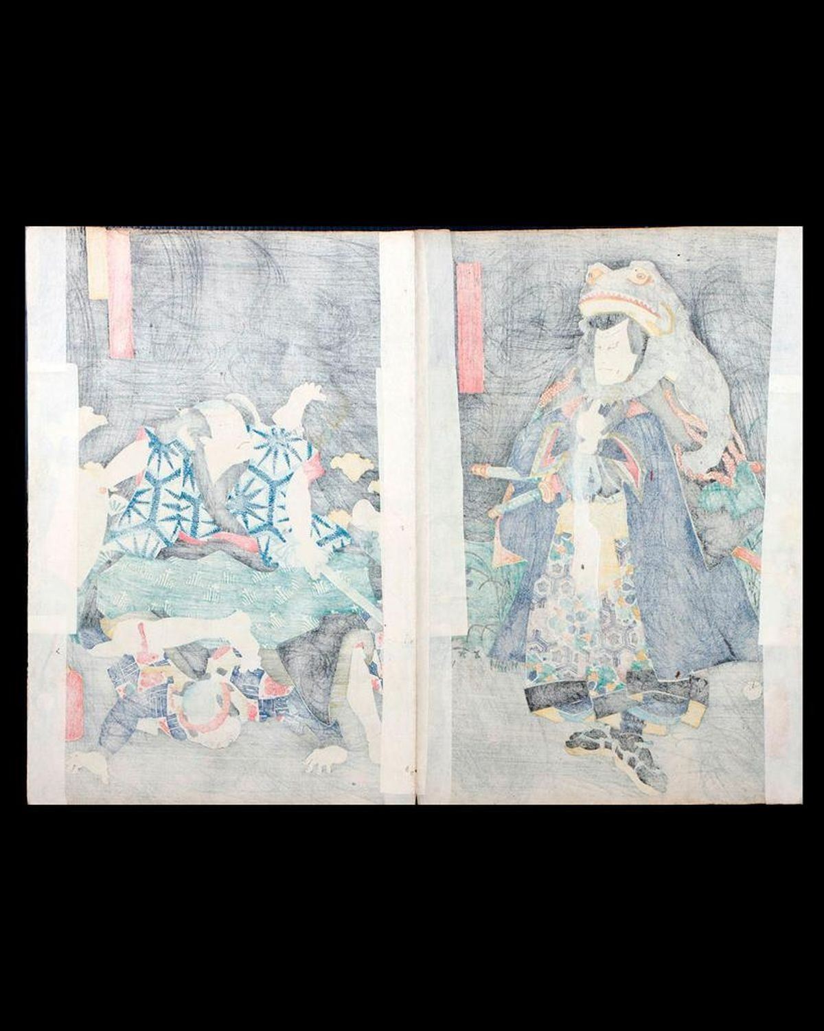 Artist : Kunisada UTAGAWA, Toyokuni III (1786-1865) Series : Ghost and Toad Magic. Date : (c.1856 - 59) Medium: Woodblock (two diptychs) Dimensions : 14 x 9 1/2in. Condition : Fading, small holes. Loss and repairs, backed, and staining.