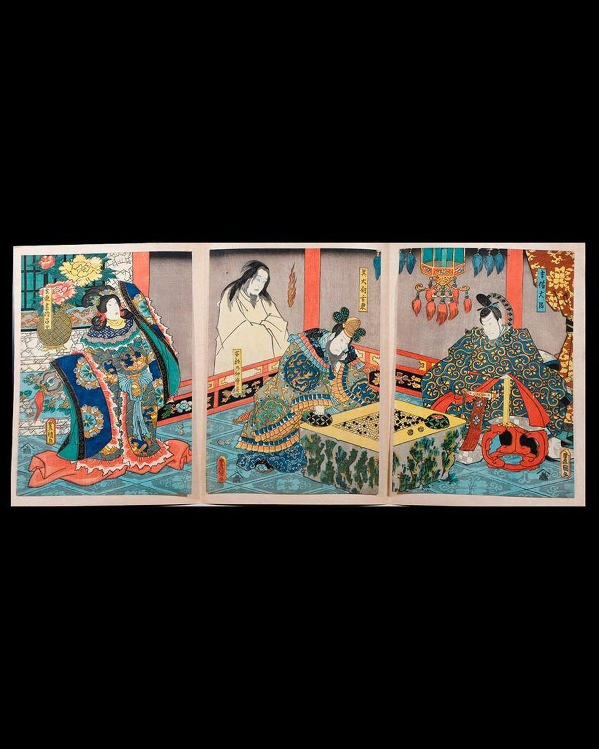 Artist : Kunisada UTAGAWA, Toyokuni III (1786-1865) Series : Ghost. Date : (c.1856 - 59) Medium: Woodblock (triptych) Dimensions : 14 x 9 1/2 in. Condition : Good color, small hole, and some thinning to paper.