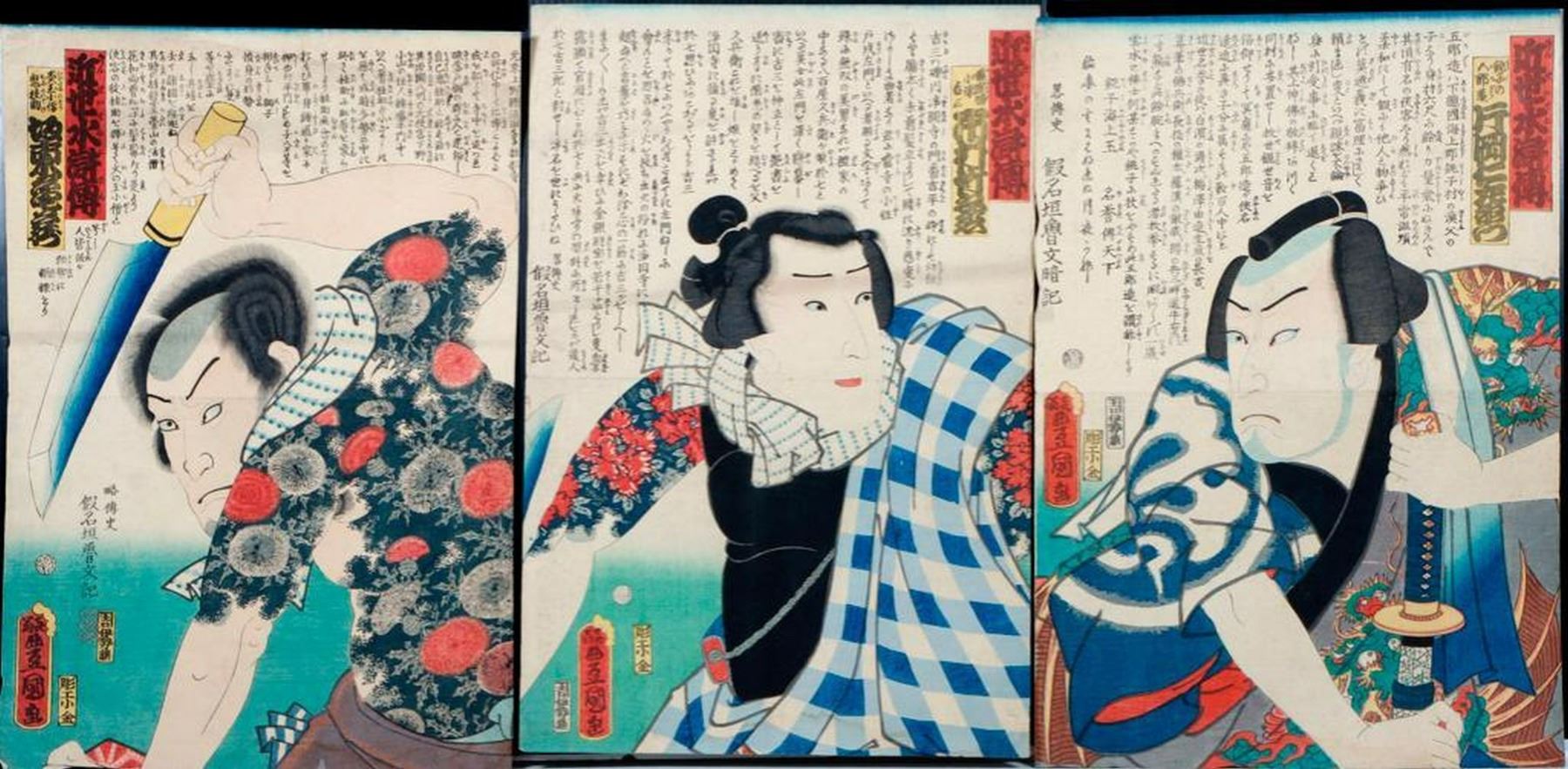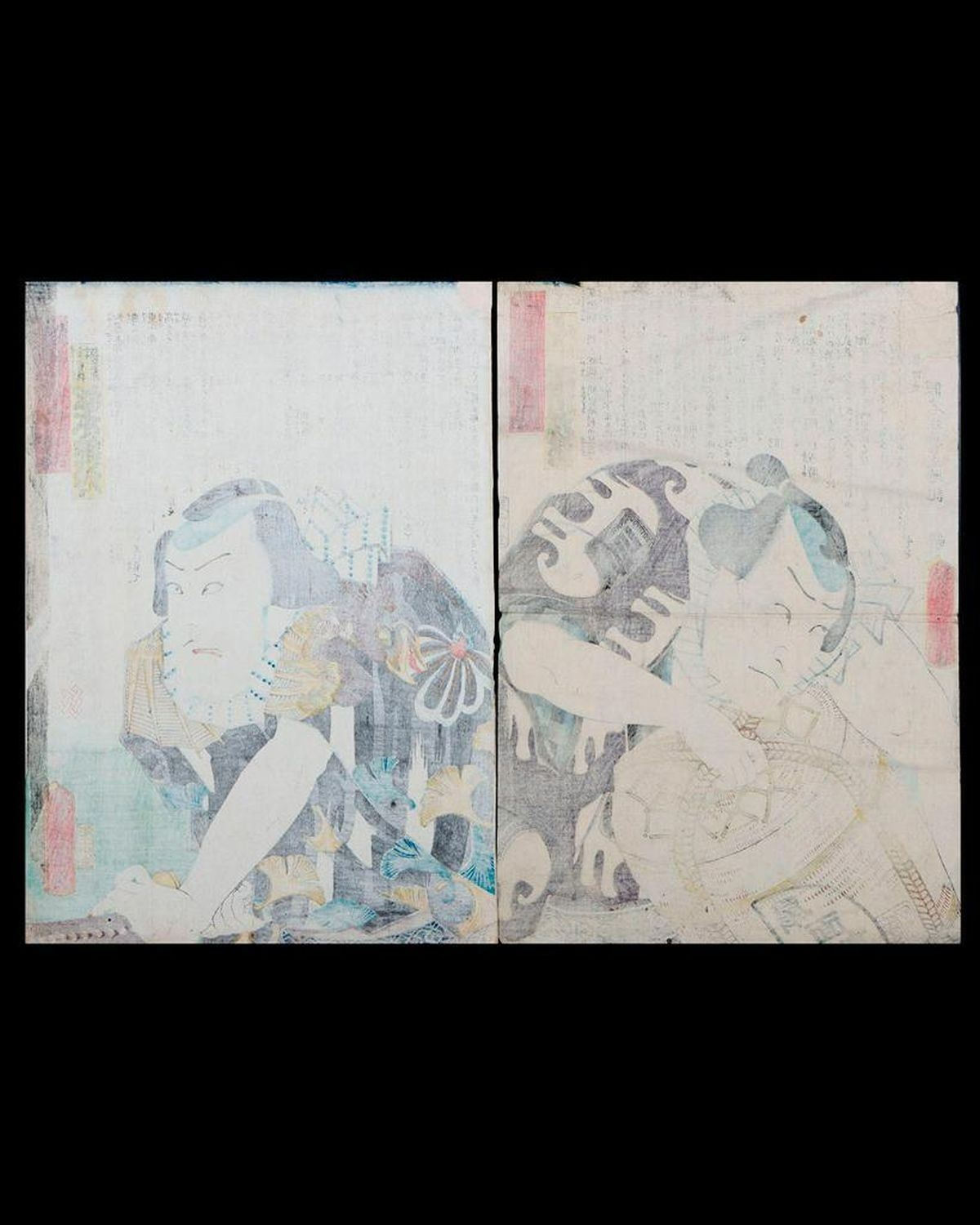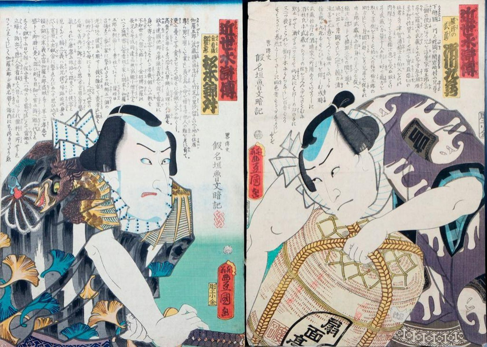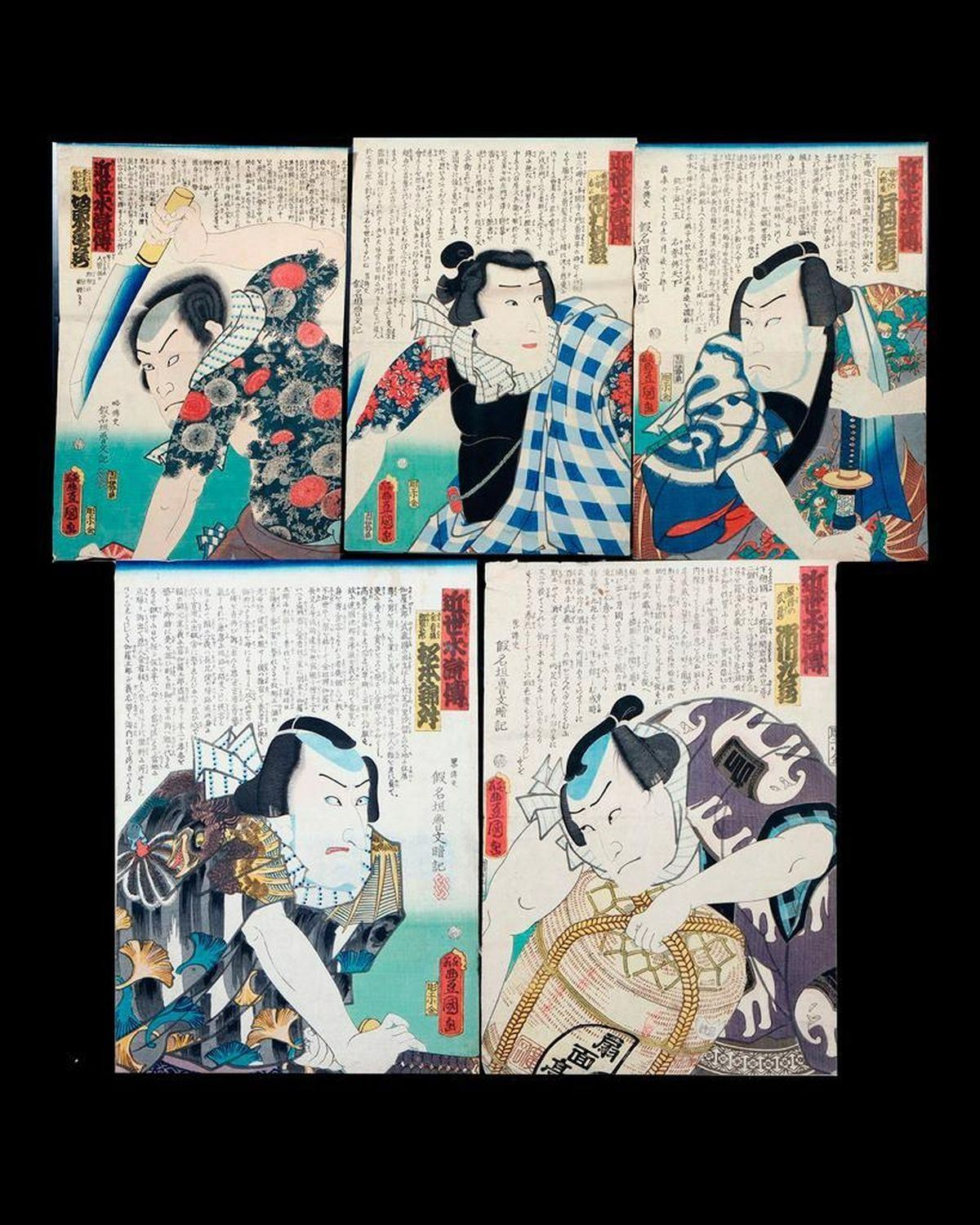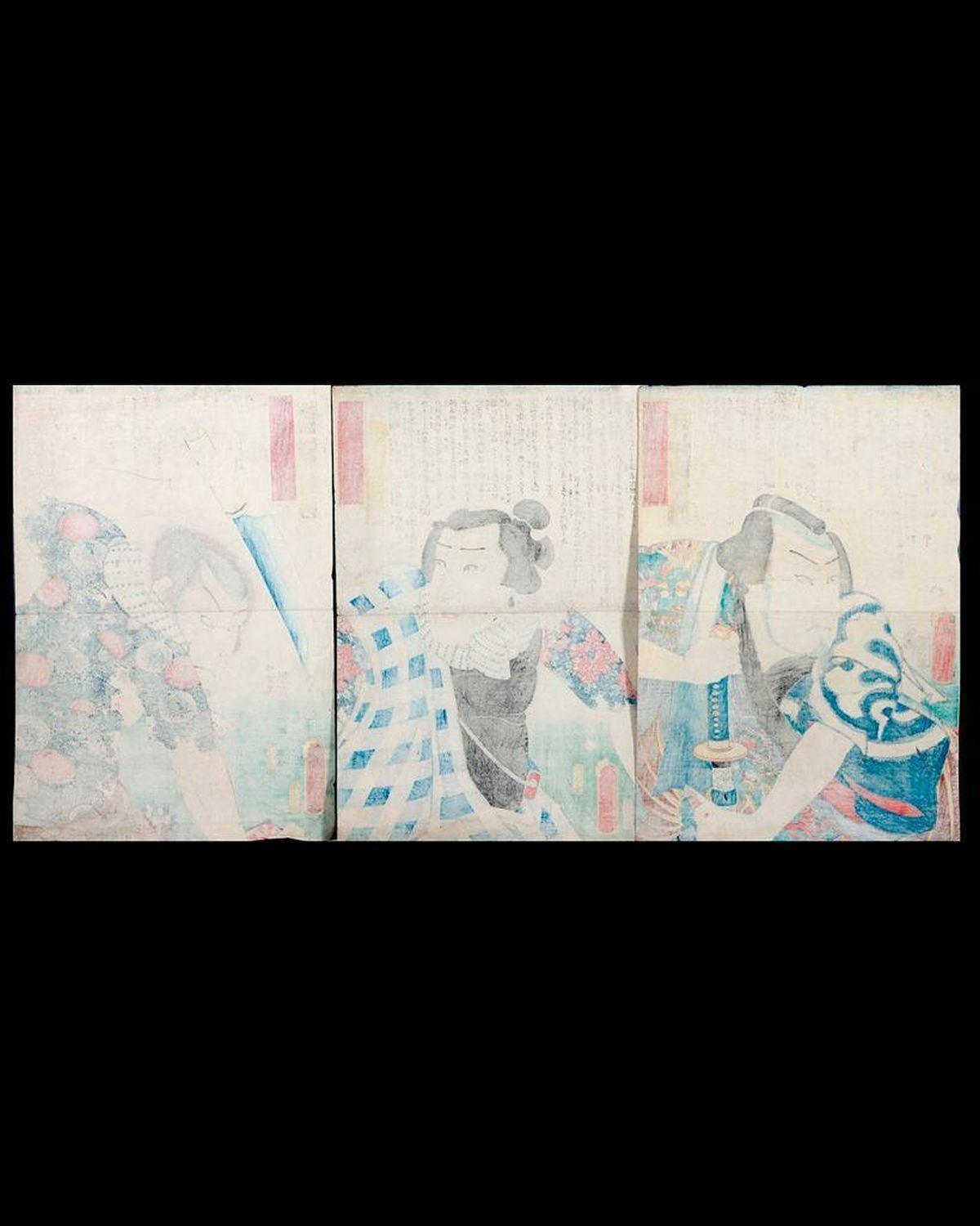 Artist : Kunisada UTAGAWA, Toyokuni III (1786-1865) Series : Actor Bando Kamezobrandishes a cooking knife as the character Oni demon Keisuke (Withothers) Date : (c.1862) Medium: Woodblock (fiveworks) Dimensions : 14 1/2 x 9 1/2in. Condition : Overall good, two with centerfolds, stains and faded.